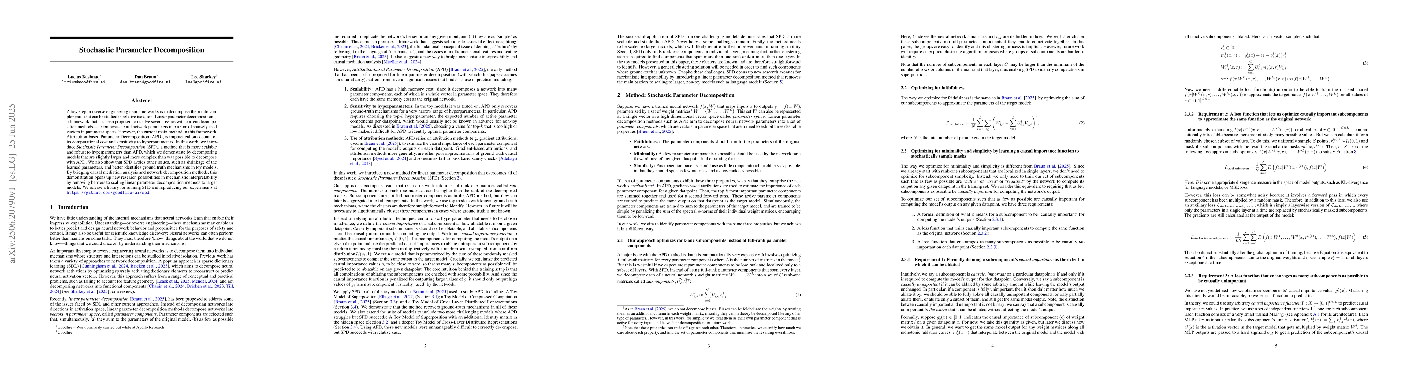 A key step in reverse engineering neural networks is to decompose them into simpler parts that can be studied in relative isolation. Linear parameter decomposition -- a framework that has been proposed to resolve several issues with current decomposition methods -- decomposes neural network parameters into a sum of sparsely used vectors in parameter space. However, the current main method in this framework, Attribution-based Parameter Decomposition (APD), is impractical on account of its computational cost and sensitivity to hyperparameters. In this work, we introduce \textit{Stochastic Parameter Decomposition} (SPD), a method that is more scalable and robust to hyperparameters than APD, which we demonstrate by decomposing models that are slightly larger and more complex than was possible to decompose with APD. We also show that SPD avoids other issues, such as shrinkage of the learned parameters, and better identifies ground truth mechanisms in toy models. By bridging causal mediation analysis and network decomposition methods, this demonstration opens up new research possibilities in mechanistic interpretability by removing barriers to scaling linear parameter decomposition methods to larger models. We release a library for running SPD and reproducing our experiments at https://github.com/goodfire-ai/spd.