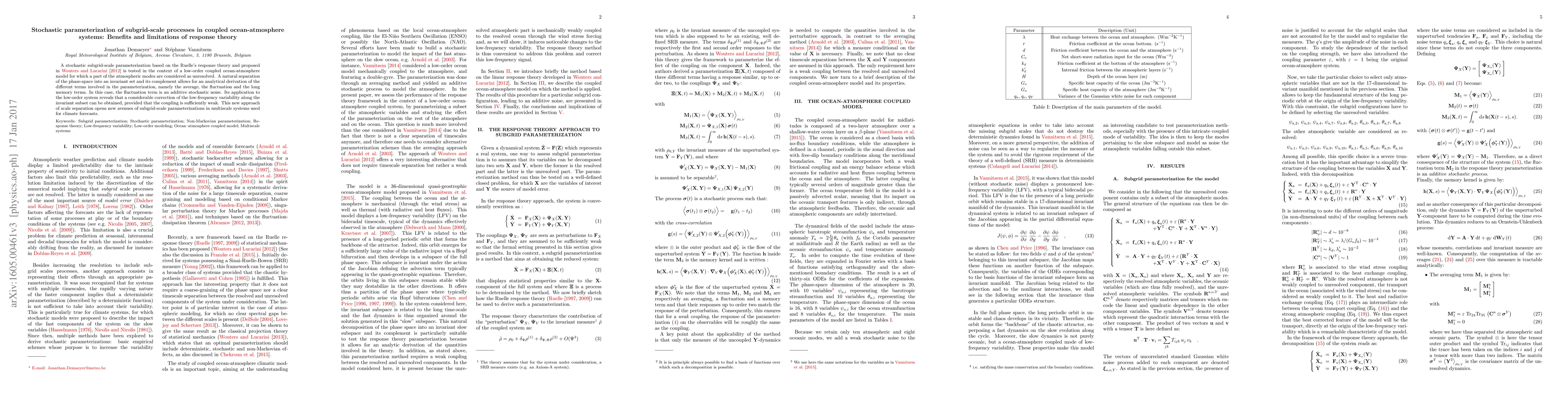 This paper tests a stochastic parameterization based on Ruelle's response theory for unresolved atmospheric modes in a coupled ocean-atmosphere model, showing it can correct low-frequency variability when coupling is weak, thus offering new avenues for climate forecast modeling.