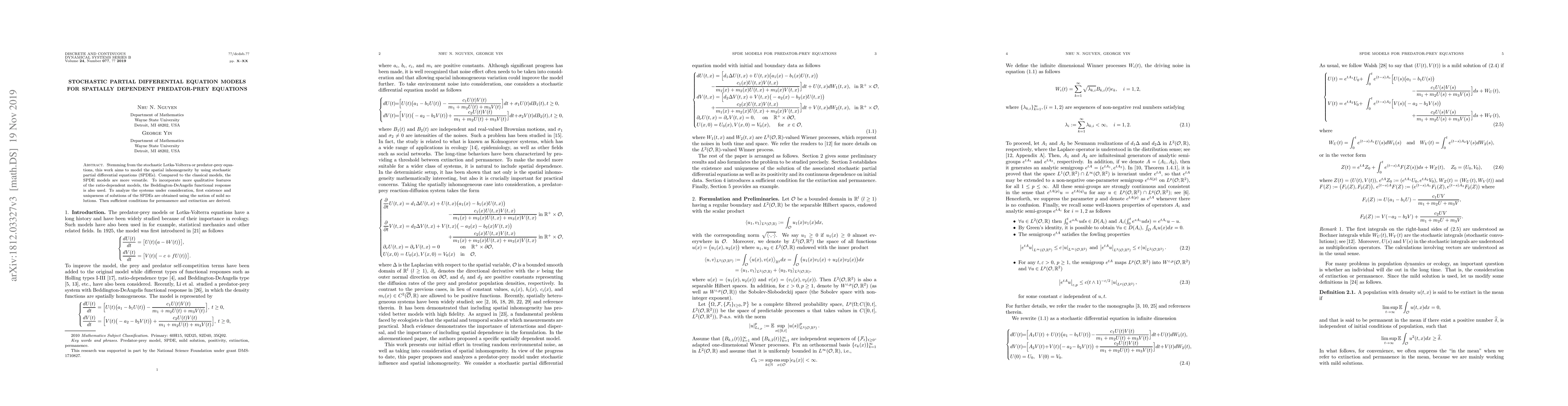 This research paper develops a stochastic partial differential equation model to study spatially dependent predator-prey equations, incorporating features of the Beddington-DeAngelis functional response. The model provides insights into conditions for permanence and extinction in such systems.