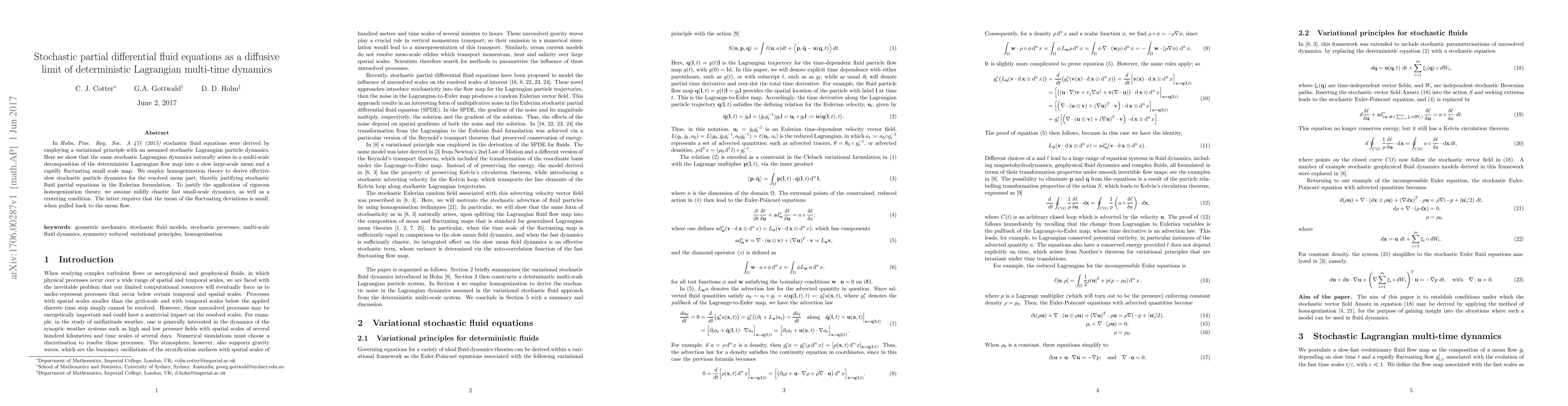 This paper demonstrates that stochastic partial differential fluid equations emerge as a diffusive limit from deterministic Lagrangian multi-time dynamics, showing that stochastic Lagrangian dynamics naturally arises from a multi-scale decomposition of the deterministic flow. The authors use homogenization theory to justify the stochastic fluid equations in the Eulerian formulation under the assumptions of mildly chaotic small-scale dynamics and a centering condition.