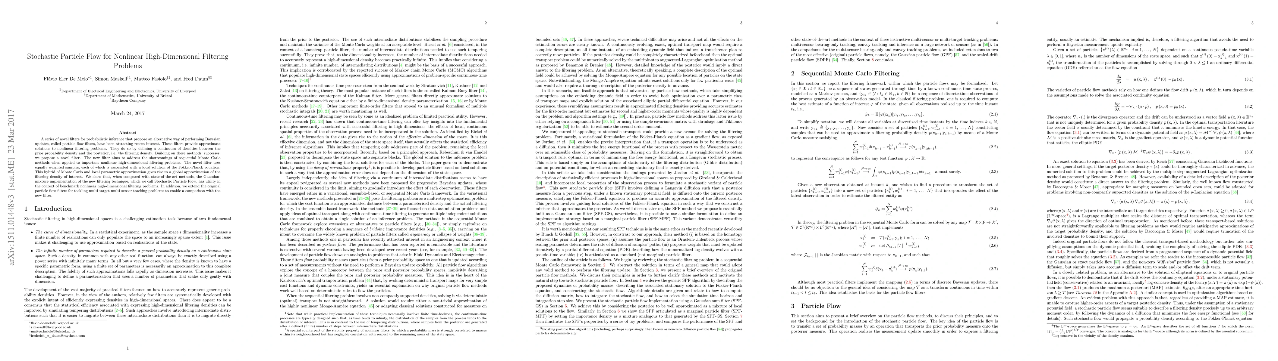 A series of novel filters for probabilistic inference that propose an alternative way of performing Bayesian updates, called particle flow filters, have been attracting recent interest. These filters provide approximate solutions to nonlinear filtering problems. They do so by defining a continuum of densities between the prior probability density and the posterior, i.e. the filtering density. Building on these methods' successes, we propose a novel filter. The new filter aims to address the shortcomings of sequential Monte Carlo methods when applied to important nonlinear high-dimensional filtering problems. The novel filter uses equally weighted samples, each of which is associated with a local solution of the Fokker-Planck equation. This hybrid of Monte Carlo and local parametric approximation gives rise to a global approximation of the filtering density of interest. We show that, when compared with state-of-the-art methods, the Gaussian-mixture implementation of the new filtering technique, which we call Stochastic Particle Flow, has utility in the context of benchmark nonlinear high-dimensional filtering problems. In addition, we extend the original particle flow filters for tackling multi-target multi-sensor tracking problems to enable a comparison with the new filter.