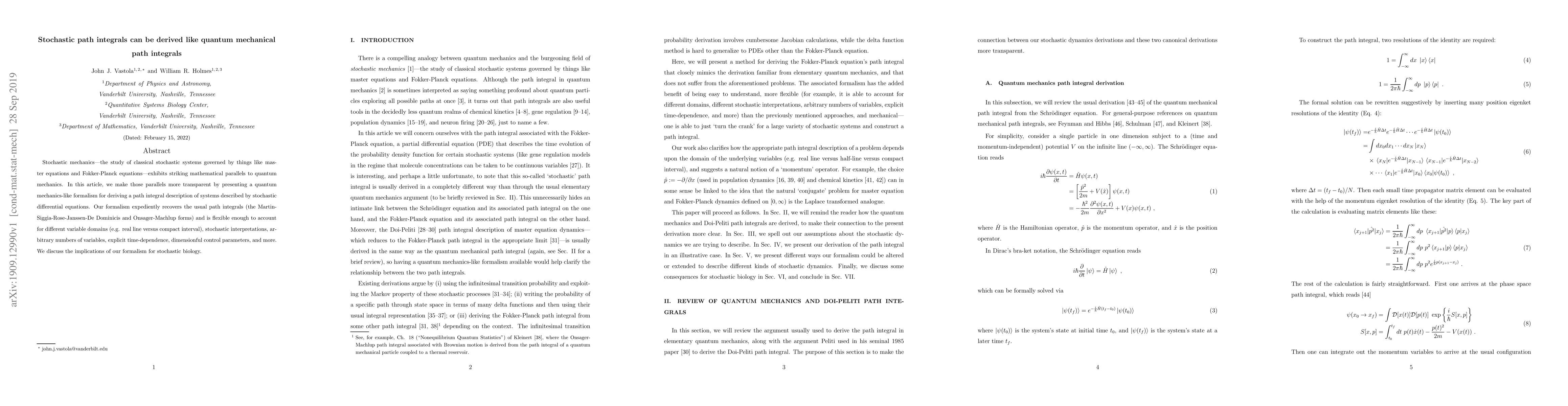 Stochastic mechanics---the study of classical stochastic systems governed by things like master equations and Fokker-Planck equations---exhibits striking mathematical parallels to quantum mechanics. In this article, we make those parallels more transparent by presenting a quantum mechanics-like formalism for deriving a path integral description of systems described by stochastic differential equations. Our formalism expediently recovers the usual path integrals (the Martin-Siggia-Rose-Janssen-De Dominicis and Onsager-Machlup forms) and is flexible enough to account for different variable domains (e.g. real line versus compact interval), stochastic interpretations, arbitrary numbers of variables, explicit time-dependence, dimensionful control parameters, and more. We discuss the implications of our formalism for stochastic biology.