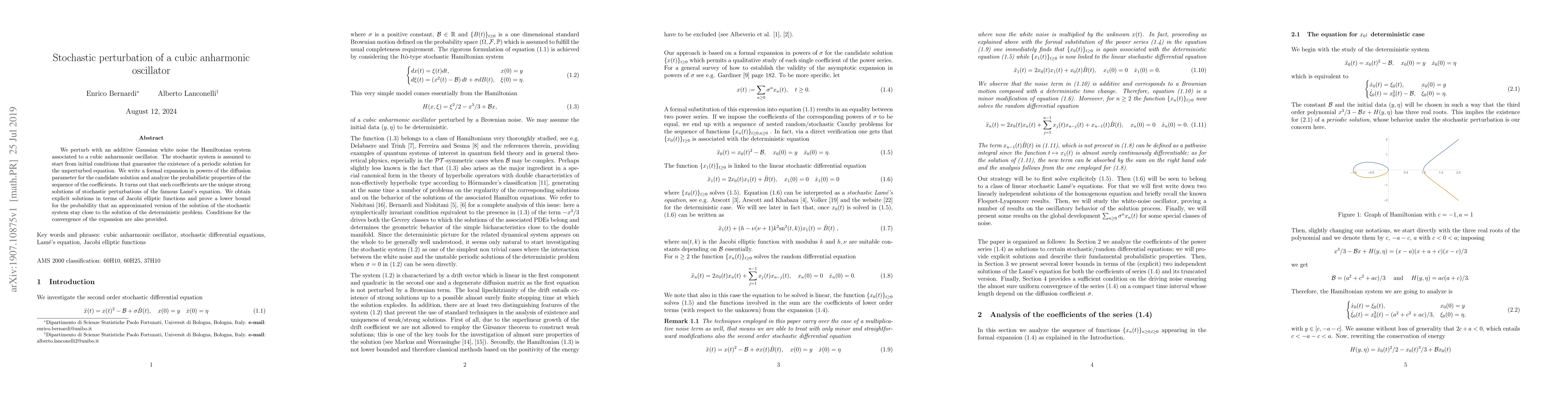 We perturb with an additive Gaussian white noise the Hamiltonian system associated to a cubic anharmonic oscillator. The stochastic system is assumed to start from initial conditions that guarantee the existence of a periodic solution for the unperturbed equation. We write a formal expansion in powers of the diffusion parameter for the candidate solution and analyze the probabilistic properties of the sequence of the coefficients. It turns out that such coefficients are the unique strong solutions of stochastic perturbations of the famous Lam\'e's equation. We obtain explicit solutions in terms of Jacobi elliptic functions and prove a lower bound for the probability that an approximated version of the solution of the stochastic system stay close to the solution of the deterministic problem. Conditions for the convergence of the expansion are also provided.