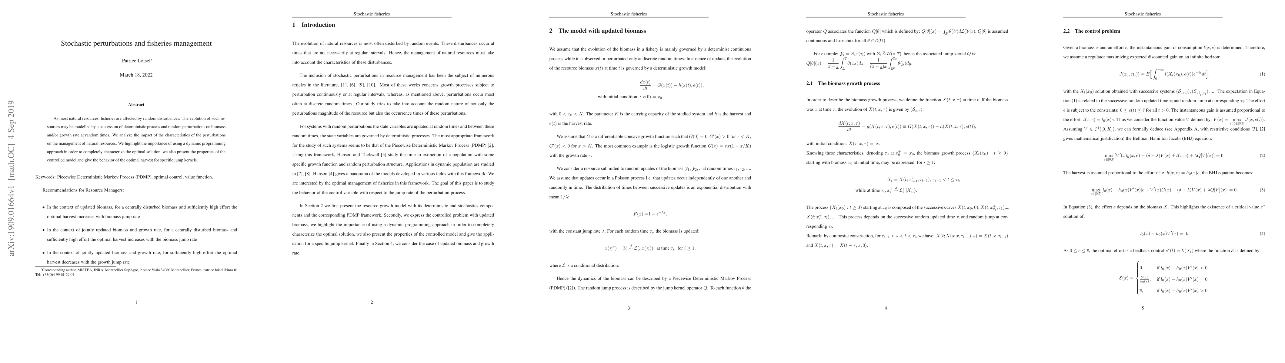This paper explores how stochastic perturbations affect fisheries management, emphasizing the need for dynamic programming to determine optimal solutions. It analyzes the impact of random disturbances on biomass and growth rates, and discusses the behavior of optimal harvest strategies under specific jump kernels.