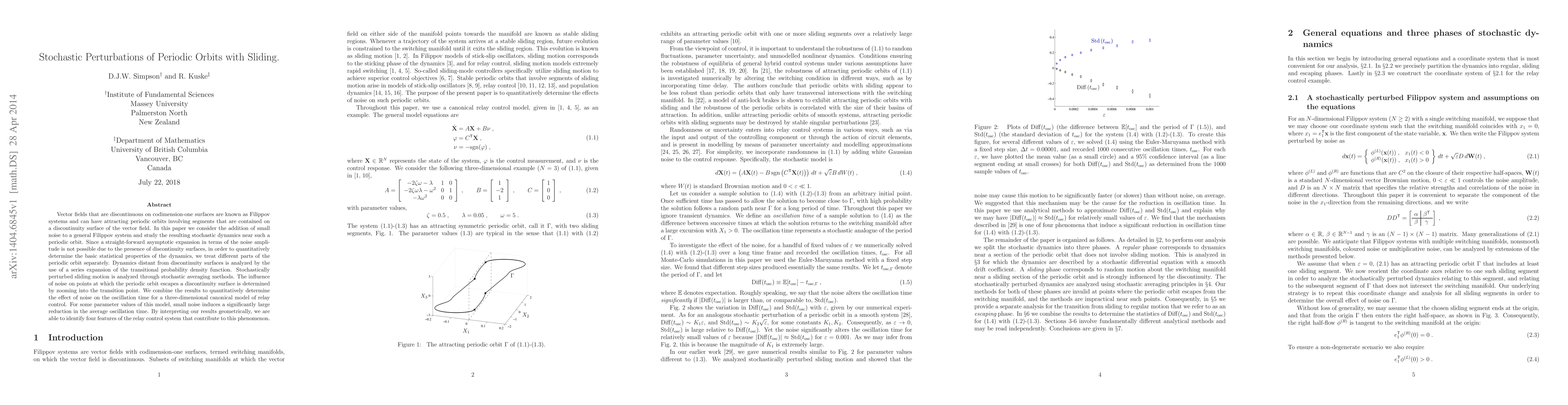 Vector fields that are discontinuous on codimension-one surfaces are known as Filippov systems and can have attracting periodic orbits involving segments that are contained on a discontinuity surface of the vector field. In this paper we consider the addition of small noise to a general Filippov system and study the resulting stochastic dynamics near such a periodic orbit. Since a straight-forward asymptotic expansion in terms of the noise amplitude is not possible due to the presence of discontinuity surfaces, in order to quantitatively determine the basic statistical properties of the dynamics, we treat different parts of the periodic orbit separately. Dynamics distant from discontinuity surfaces is analyzed by the use of a series expansion of the transitional probability density function. Stochastically perturbed sliding motion is analyzed through stochastic averaging methods. The influence of noise on points at which the periodic orbit escapes a discontinuity surface is determined by zooming into the transition point. We combine the results to quantitatively determine the effect of noise on the oscillation time for a three-dimensional canonical model of relay control. For some parameter values of this model, small noise induces a significantly large reduction in the average oscillation time. By interpreting our results geometrically, we are able to identify four features of the relay control system that contribute to this phenomenon.