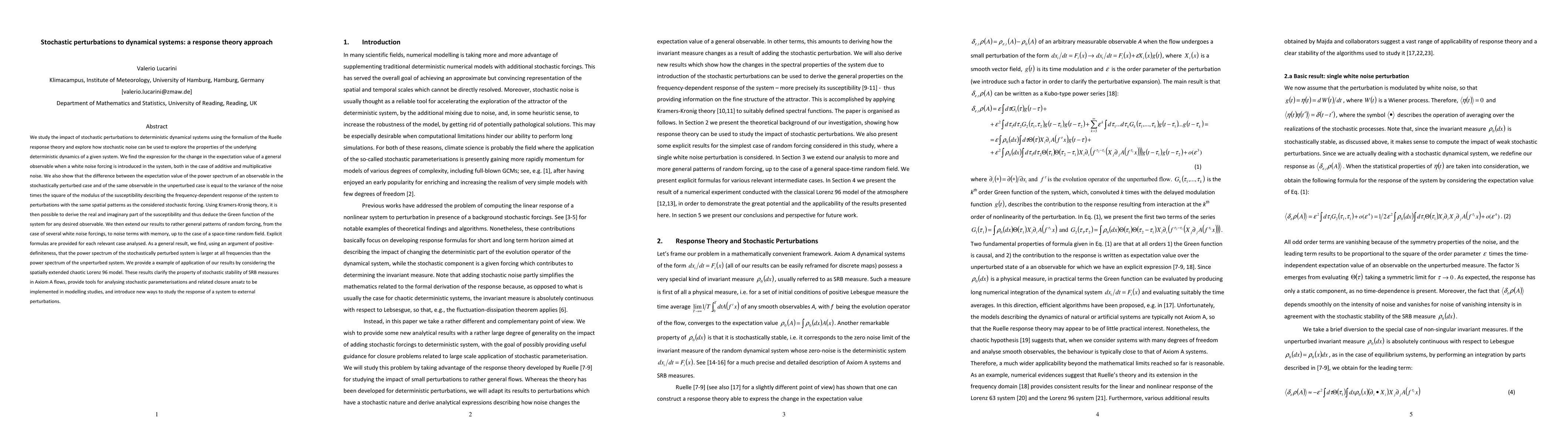 This paper investigates the effects of stochastic perturbations on deterministic dynamical systems using Ruelle response theory, deriving expressions for changes in observable expectations under white noise. It demonstrates that the difference in power spectra between perturbed and unperturbed systems equals the noise variance times the susceptibility squared, and provides explicit formulas for various noise patterns. The study concludes that stochastic perturbations increase system power spectra, with applications to the Lorenz 96 model.