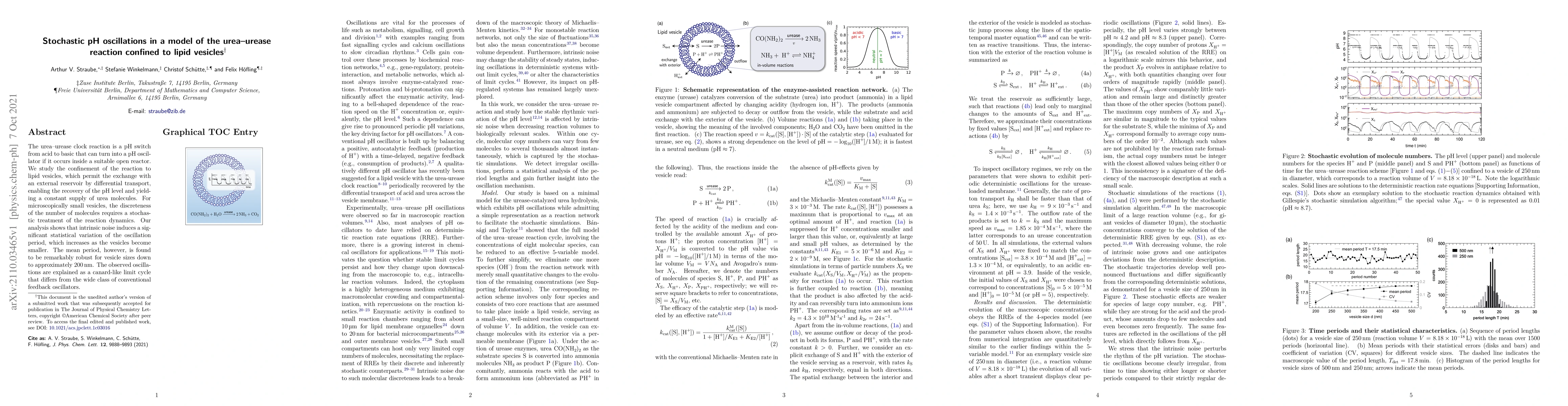 The urea-urease clock reaction is a pH switch from acid to basic that can turn into a pH oscillator if it occurs inside a suitable open reactor. We study the confinement of the reaction to lipid vesicles, which permit the exchange with an external reservoir by differential transport, enabling the recovery of the pH level and yielding a constant supply of urea molecules.For microscopically small vesicles, the discreteness of the number of molecules requires a stochastic treatment of the reaction dynamics. Our analysis shows that intrinsic noise induces a significant statistical variation of the oscillation period, which increases as the vesicles become smaller. The mean period, however, is found to be remarkably robust for vesicle sizes down to approximately 200 nm. The observed oscillations are explained as a canard-like limit cycle that differs from the wide class of conventional feedback oscillators.