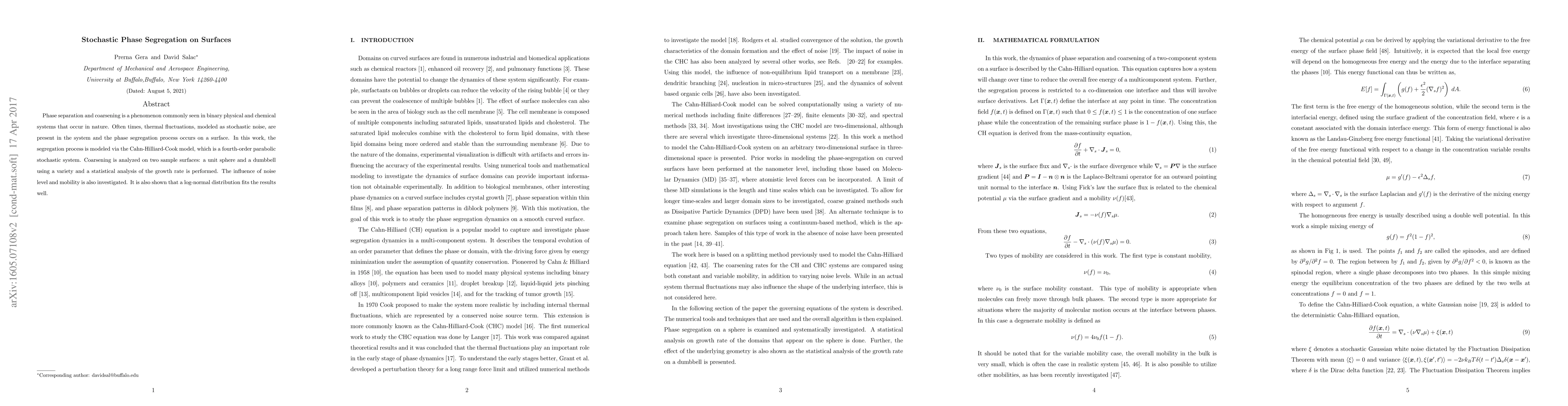 Researchers studied how thermal fluctuations affect phase segregation on surfaces using a complex mathematical model, finding that a log-normal distribution fits the results well and analyzing growth rates on different shapes.