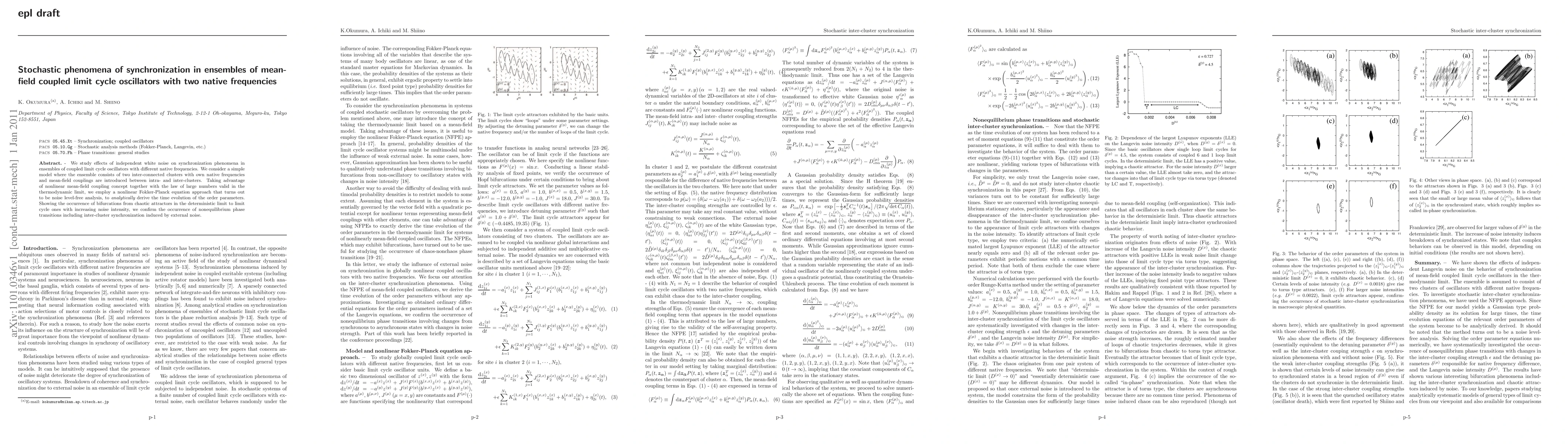 We study effects of independent white noise on synchronization phenomena in ensembles of coupled limit cycle oscillators with different native frequencies. We consider a simple model where the ensemble consists of two inter-connected clusters with own native frequencies and mean-field couplings are introduced between intra- and inter-clusters. Taking advantage of nonlinear mean-field coupling concept together with the law of large numbers valid in the thermodynamic limit, we employ a nonlinear Fokker-Planck equation approach that turns out to be noise level-free analysis, to analytically derive the time evolution of the order parameters. Showing the occurrence of bifurcations from chaotic attractors in the deterministic limit to limit cycle ones with increasing noise intensity, we confirm the occurrence of nonequilibrium phase transitions including inter-cluster synchronization induced by external noise.