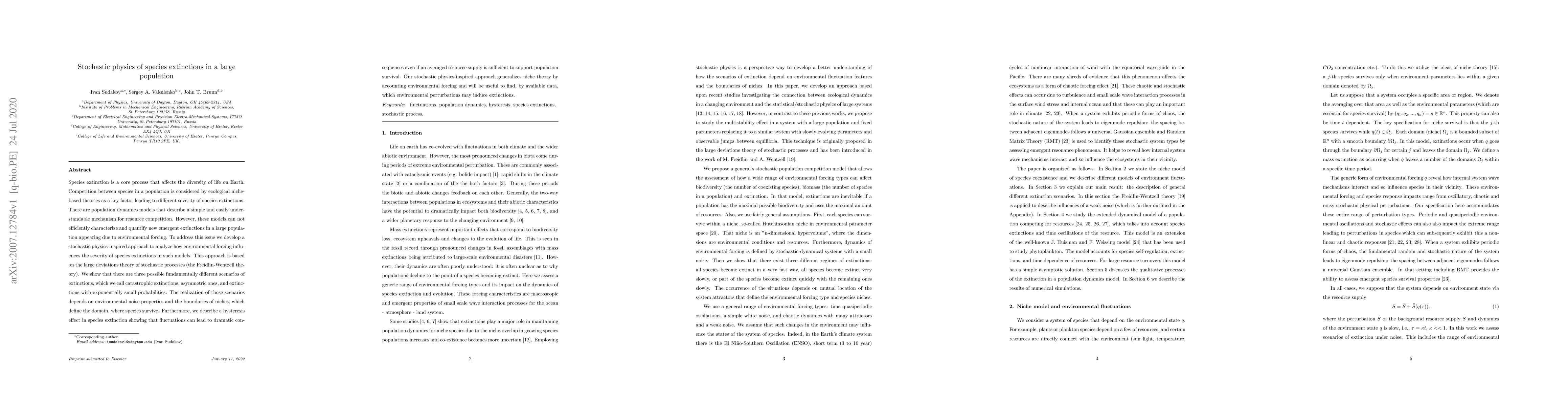 The approach combines stochastic physics with ecological niche theory, offering a fresh perspective on species extinctions by accounting for environmental forcing and revealing hysteresis effects in extinction probabilities.