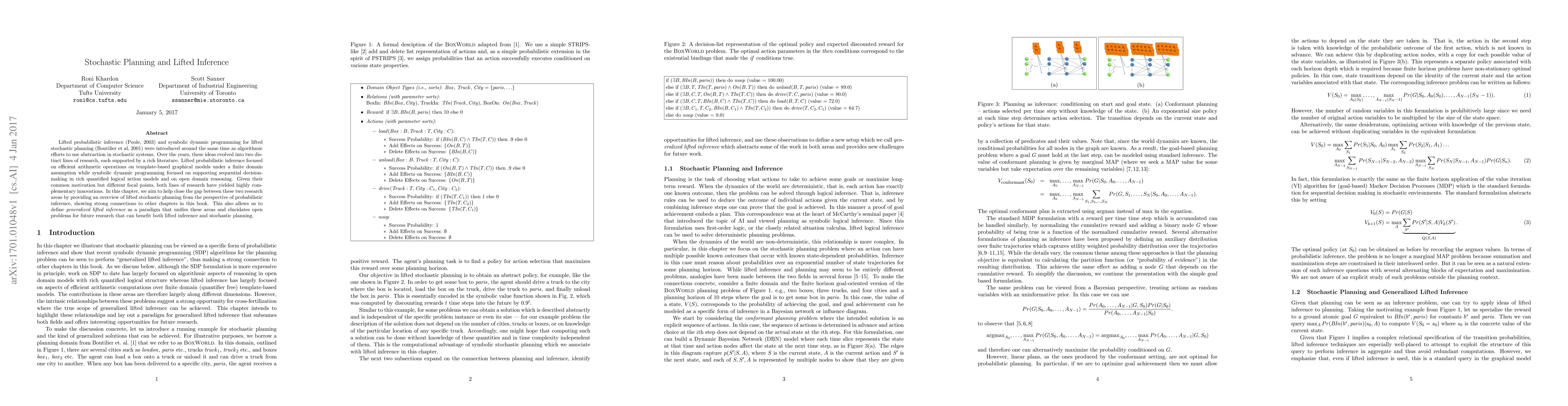 This paper aims to unify two research areas: lifted probabilistic inference and symbolic dynamic programming for stochastic planning, highlighting their complementary innovations and suggesting a new paradigm called Generalized Lifted Inference.