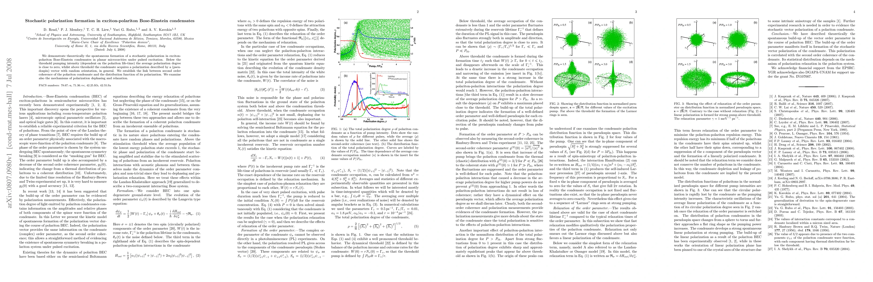 This paper theoretically explores the spontaneous formation of stochastic polarization in exciton-polariton Bose-Einstein condensates under pulsed excitation, showing that polarization emerges above a threshold pumping intensity with random orientation. The study links second-order coherence to the polarization distribution and investigates polarization dephasing and relaxation mechanisms.
