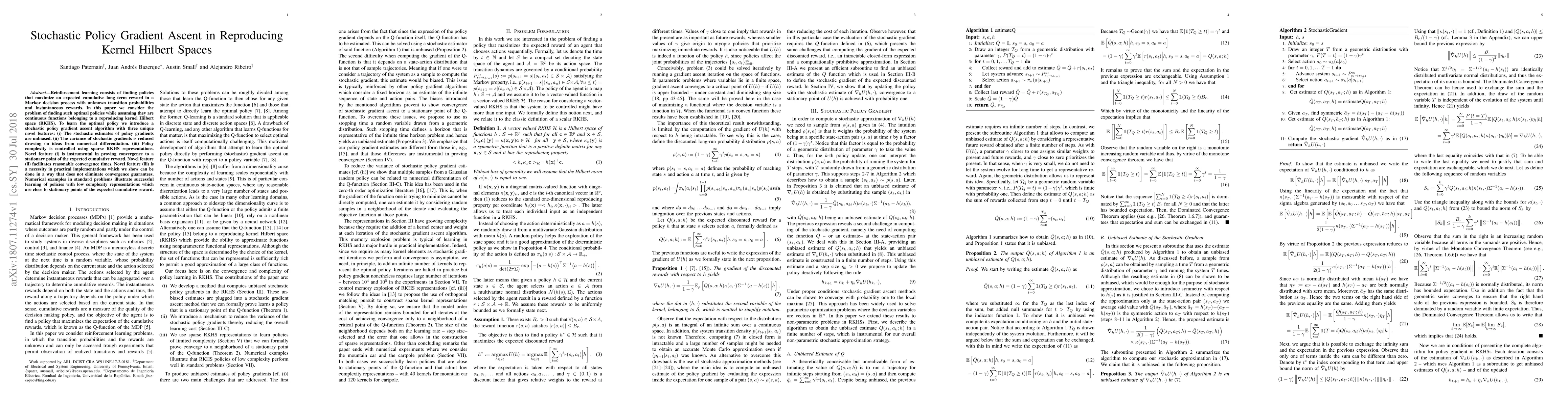 This paper proposes a stochastic policy gradient ascent algorithm for reinforcement learning in RKHS, featuring unbiased gradient estimates, reduced variance, and sparse representations to control policy complexity. The method ensures convergence and practical applicability, as demonstrated by successful policy learning in standard problems.