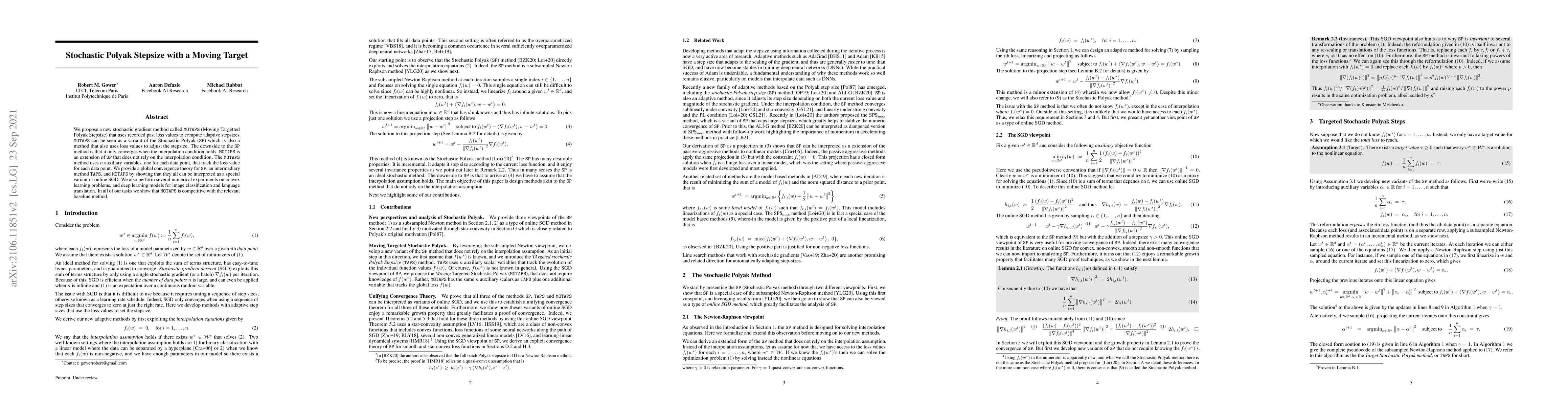 MOTAPS, a new stochastic gradient method, uses past loss values to compute adaptive stepsizes, outperforming the Stochastic Polyak method in convex learning and deep learning tasks.