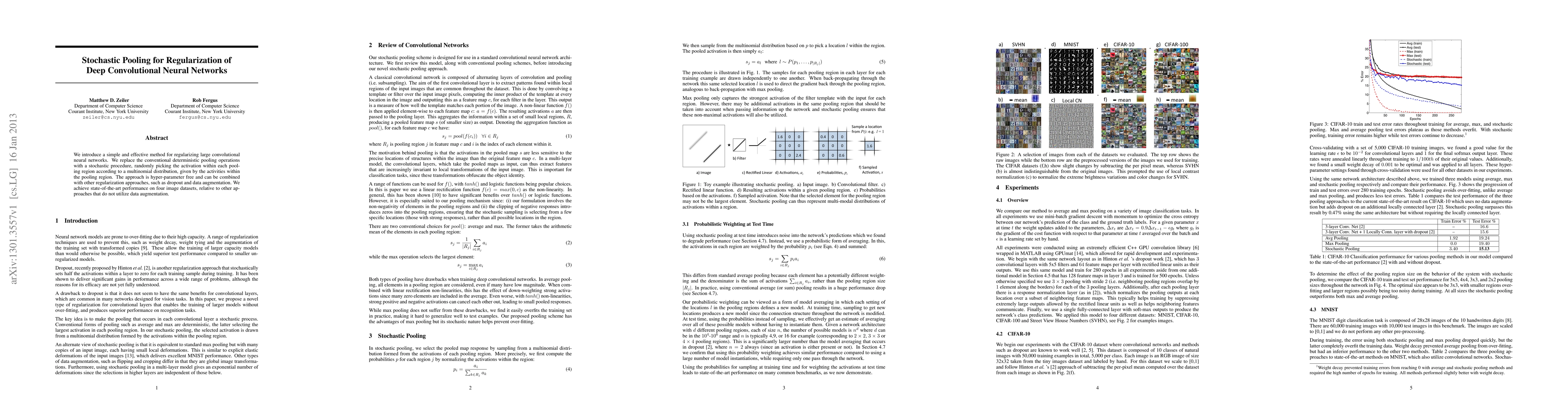 We introduce a simple and effective method for regularizing large convolutional neural networks. We replace the conventional deterministic pooling operations with a stochastic procedure, randomly picking the activation within each pooling region according to a multinomial distribution, given by the activities within the pooling region. The approach is hyper-parameter free and can be combined with other regularization approaches, such as dropout and data augmentation. We achieve state-of-the-art performance on four image datasets, relative to other approaches that do not utilize data augmentation.