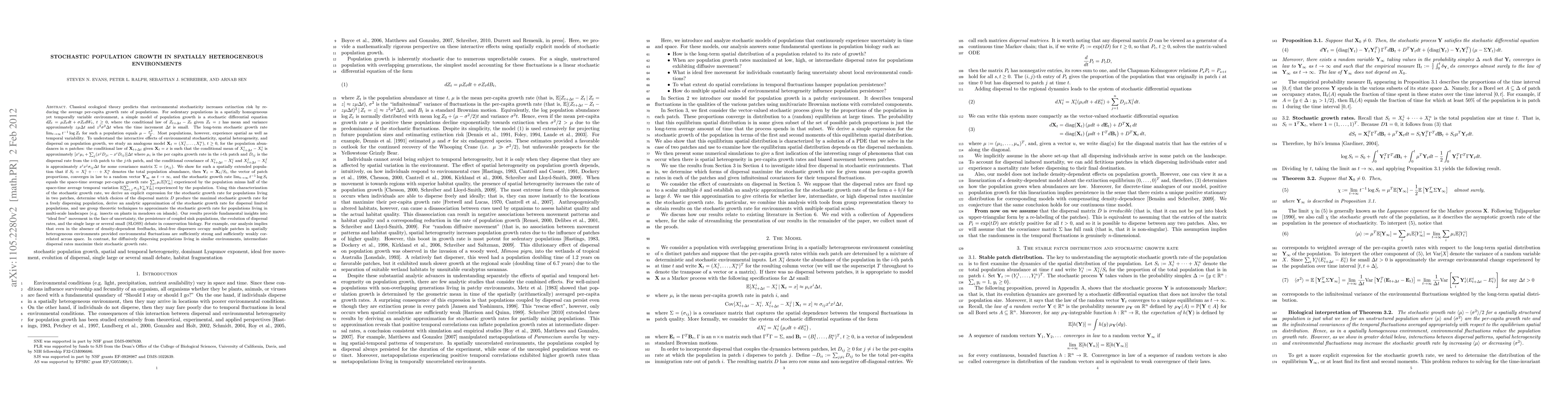 This paper explores how environmental stochasticity, spatial heterogeneity, and dispersal affect population growth in heterogeneous environments. It demonstrates that the stochastic growth rate equals the space-time average per-capita growth rate minus half the space-time average temporal variation, providing insights into "ideal free" movement, coupled sink populations, dispersal rate evolution, and conservation strategies.