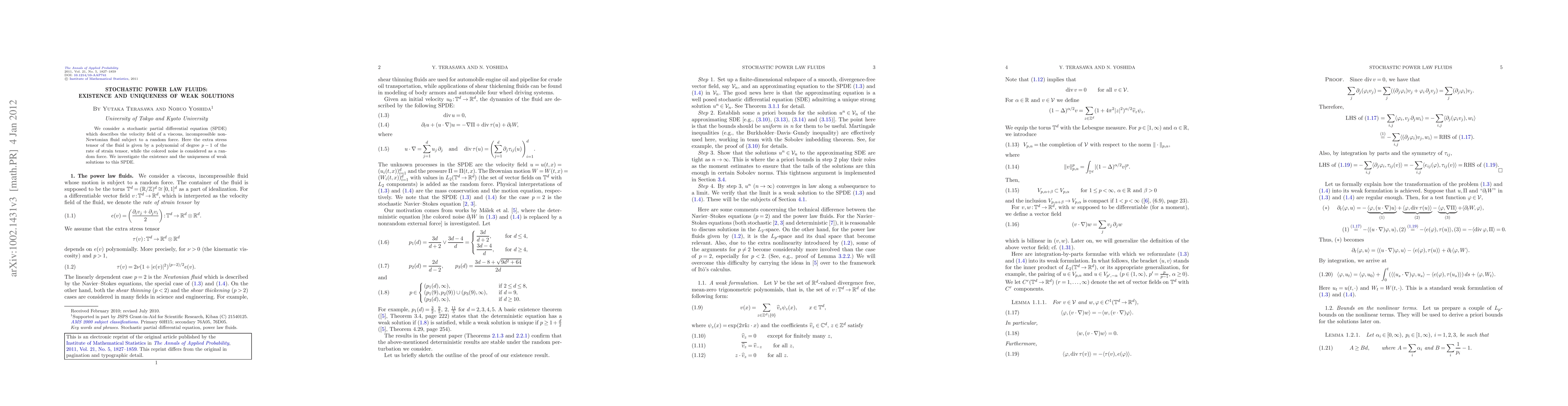 We consider a stochastic partial differential equation (SPDE) which describes the velocity field of a viscous, incompressible non-Newtonian fluid subject to a random force. Here the extra stress tensor of the fluid is given by a polynomial of degree $p-1$ of the rate of strain tensor, while the colored noise is considered as a random force. We investigate the existence and the uniqueness of weak solutions to this SPDE.