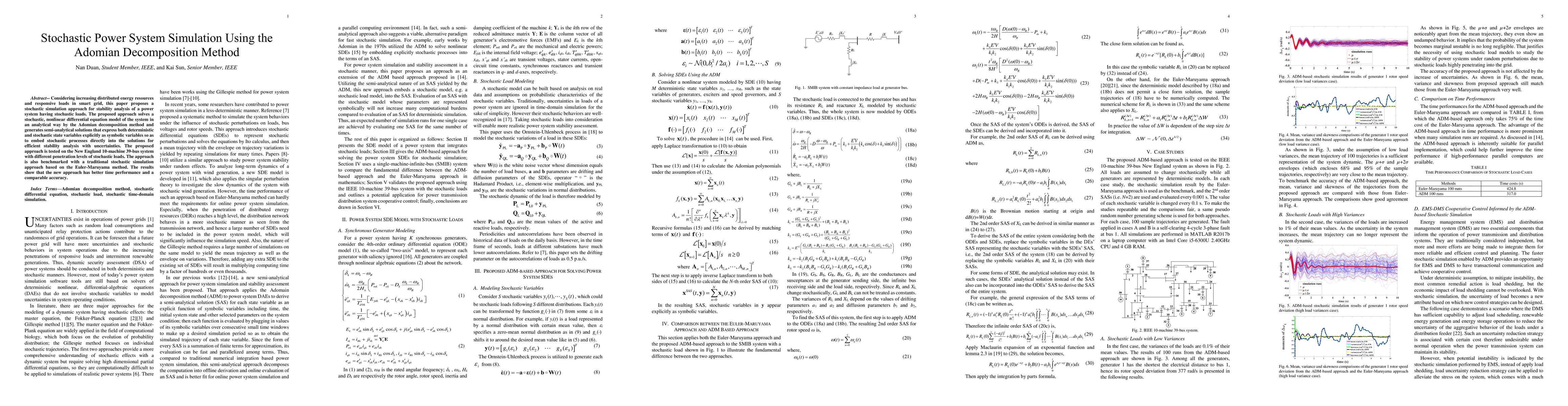 This paper proposes a stochastic simulation method for power system stability analysis using the Adomian decomposition method, generating semi-analytical solutions for efficient stability analysis under uncertainty. The method is tested on the New England 10-machine system, showing improved time performance compared to traditional Euler-Maruyama methods.