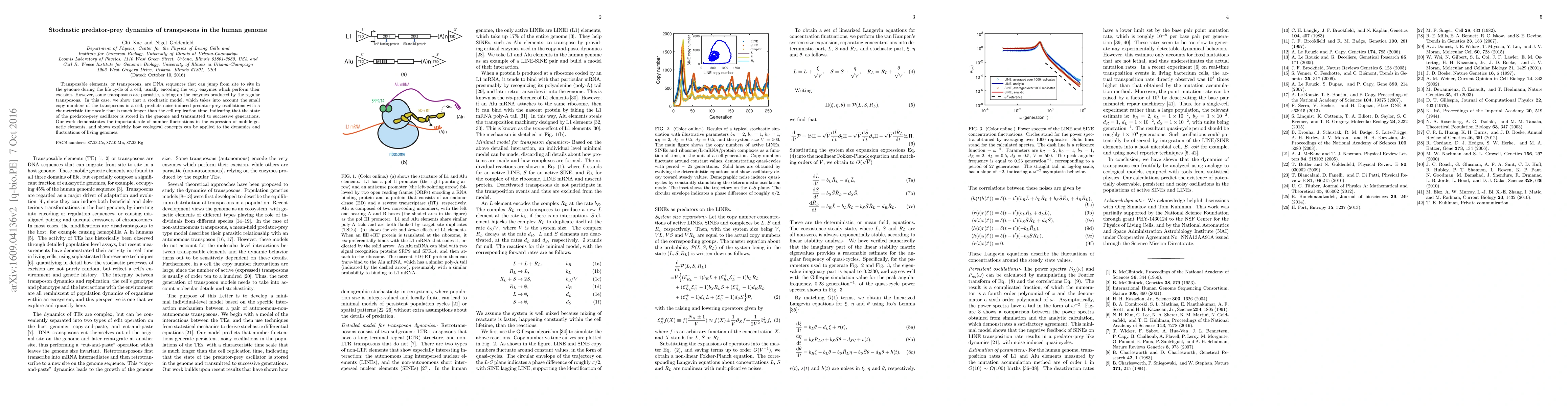 This paper investigates stochastic dynamics in the interactions between parasitic and regular transposons in the human genome, revealing noise-induced predator-prey oscillations with a long characteristic time scale. The study highlights the role of small transposon copy numbers in genome dynamics and demonstrates the application of ecological concepts to genetic element fluctuations.
