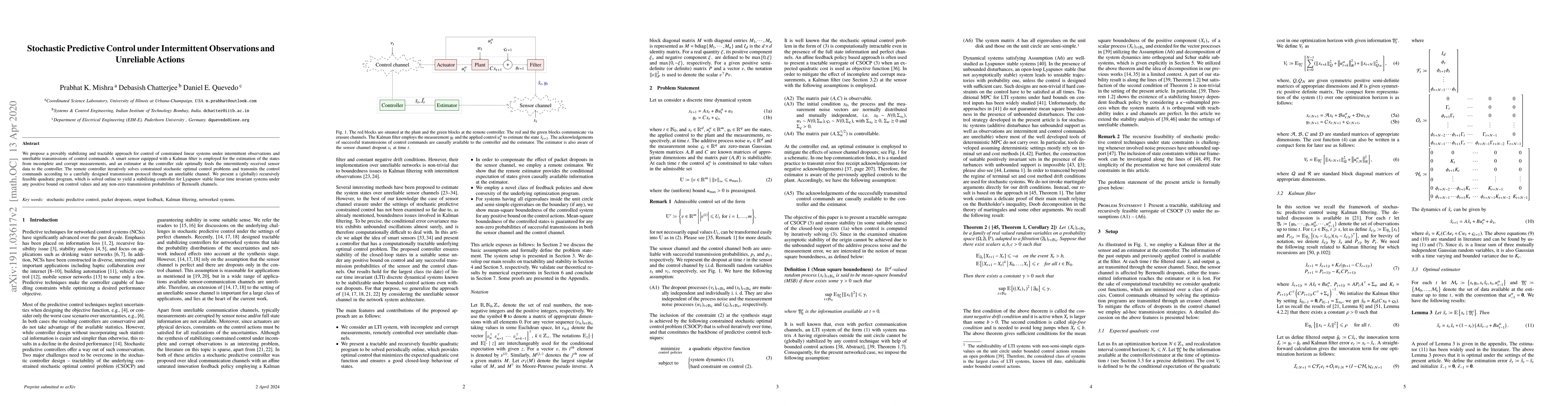 This paper presents a method for stabilizing linear systems under intermittent observations and unreliable control command transmissions. It employs a Kalman filter for state estimation and a recursive quadratic program for solving stochastic optimal control problems, ensuring global feasibility and stability despite communication constraints.