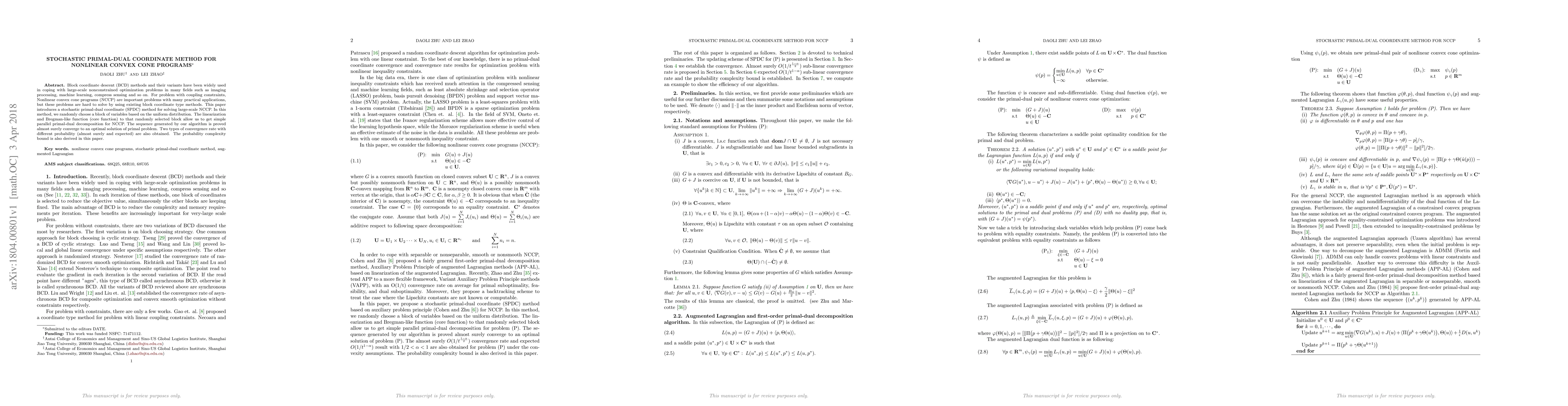 The paper introduces a stochastic primal-dual coordinate (SPDC) method for solving large-scale nonlinear convex cone programs (NCCP). The method utilizes random block selection and primal-dual decomposition, leading to a simple parallel implementation.