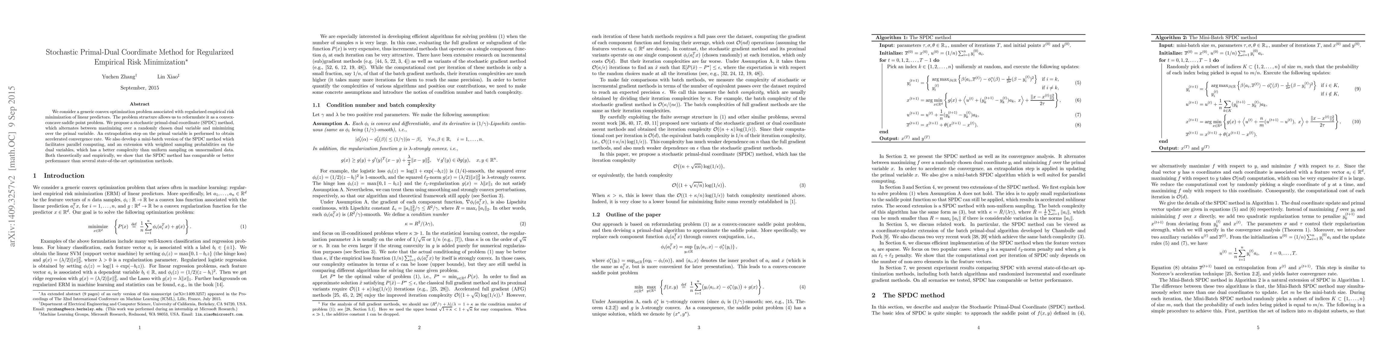 This paper proposes a stochastic primal-dual coordinate method (SPDC) for regularized empirical risk minimization, achieving accelerated convergence through an extrapolation step. It also introduces mini-batch and weighted sampling variants, demonstrating comparable or superior performance to other state-of-the-art optimization methods both theoretically and empirically.