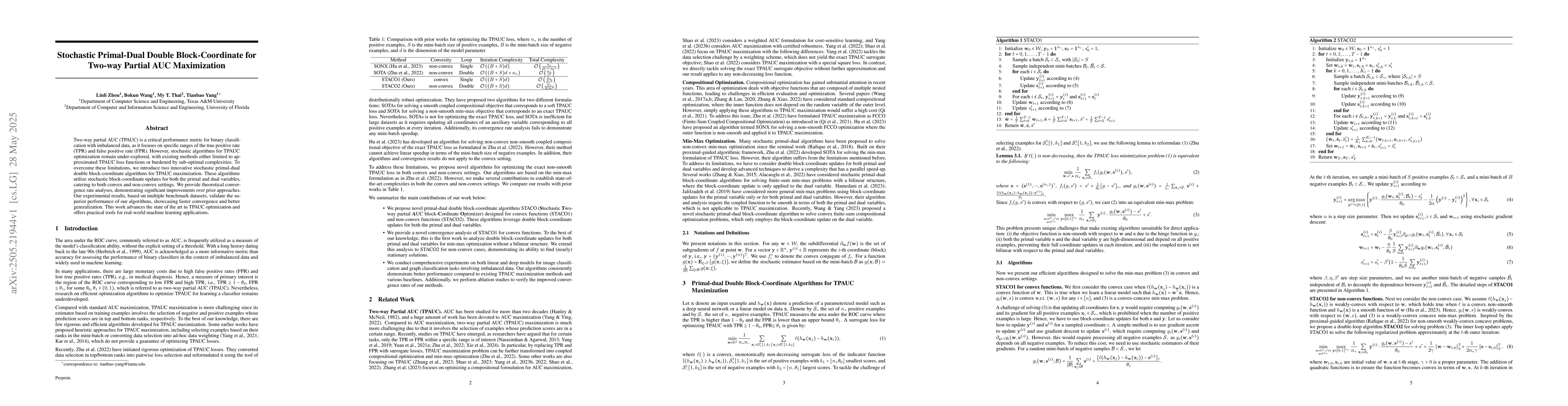 Innovative stochastic primal-dual double block-coordinate algorithms for TPAUC maximization with theoretical convergence rate guarantees.