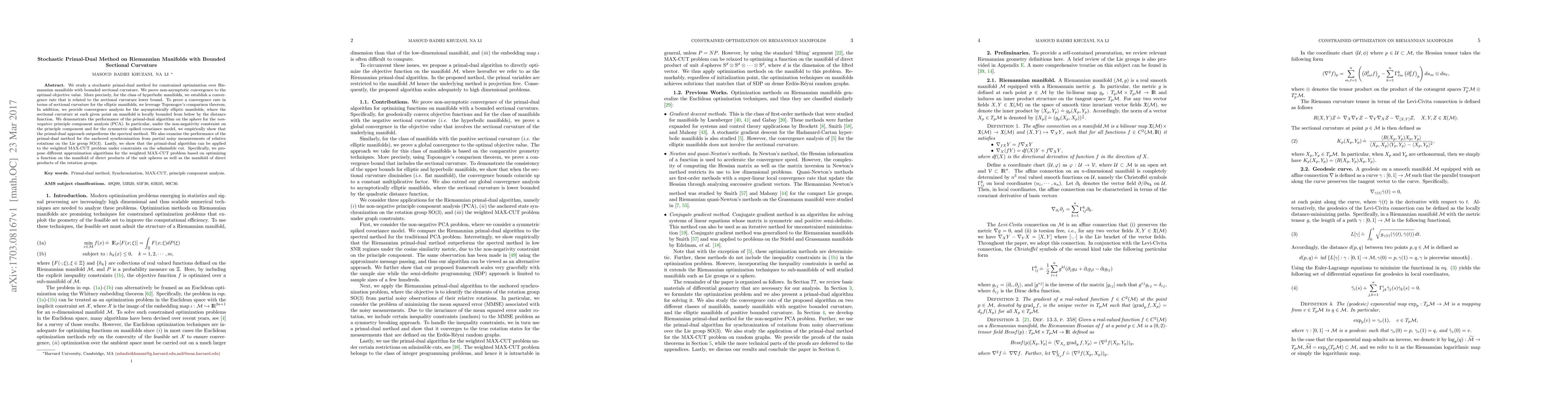 This paper develops a stochastic primal-dual method for optimization on Riemannian manifolds with bounded sectional curvature, proving non-asymptotic convergence and establishing convergence rates tied to the sectional curvature. It demonstrates the method's effectiveness on hyperbolic, elliptic, and asymptotically elliptic manifolds, showcasing superior performance in non-negative PCA and anchored synchronization tasks.