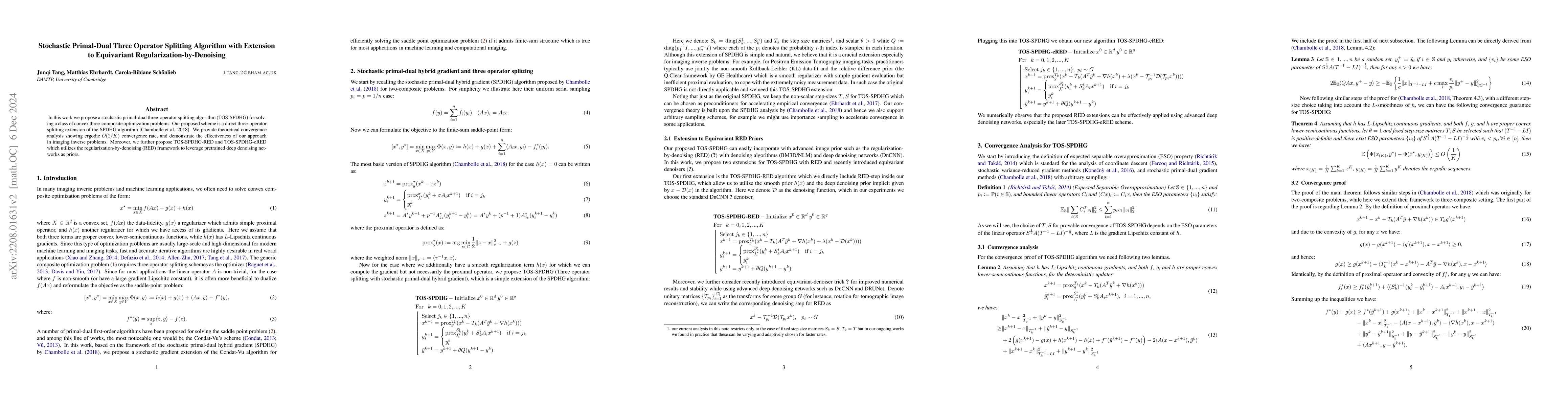 The paper introduces a novel stochastic primal-dual three-operator splitting algorithm for convex three-composite optimization problems, extending the SPDHG algorithm with theoretical convergence analysis and practical effectiveness in imaging inverse problems. The proposed method achieves an ergodic convergence rate of O(1/K).