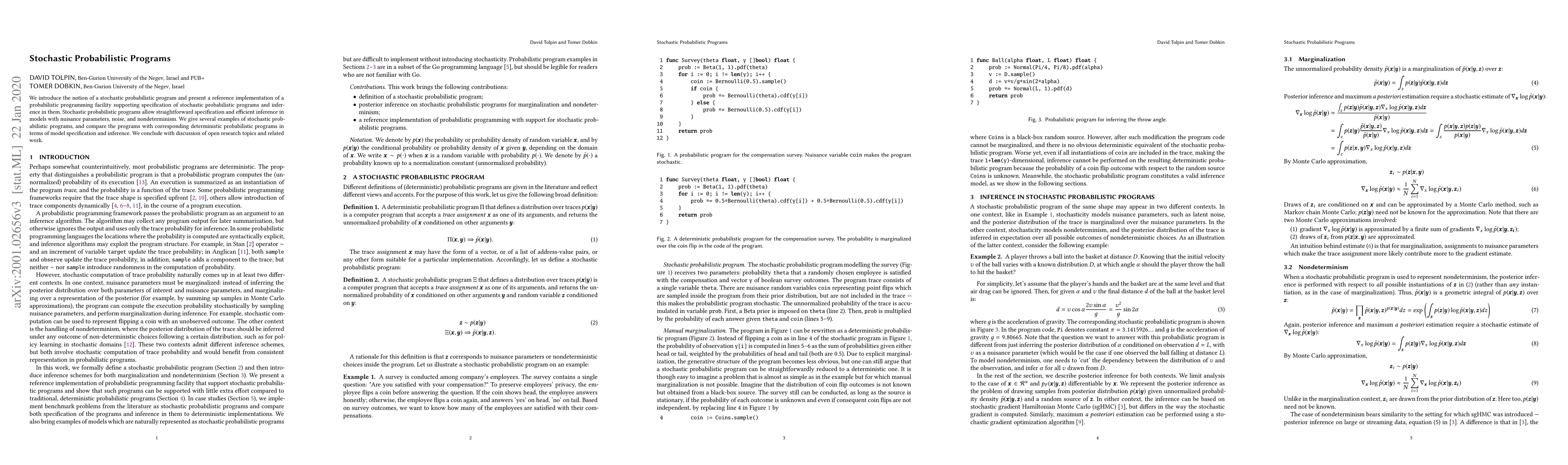This paper introduces stochastic probabilistic programs, offering a reference implementation for their specification and inference, and highlights their advantages over deterministic counterparts in handling nuisance parameters, noise, and nondeterminism. It concludes with a discussion on future research directions and related work.
