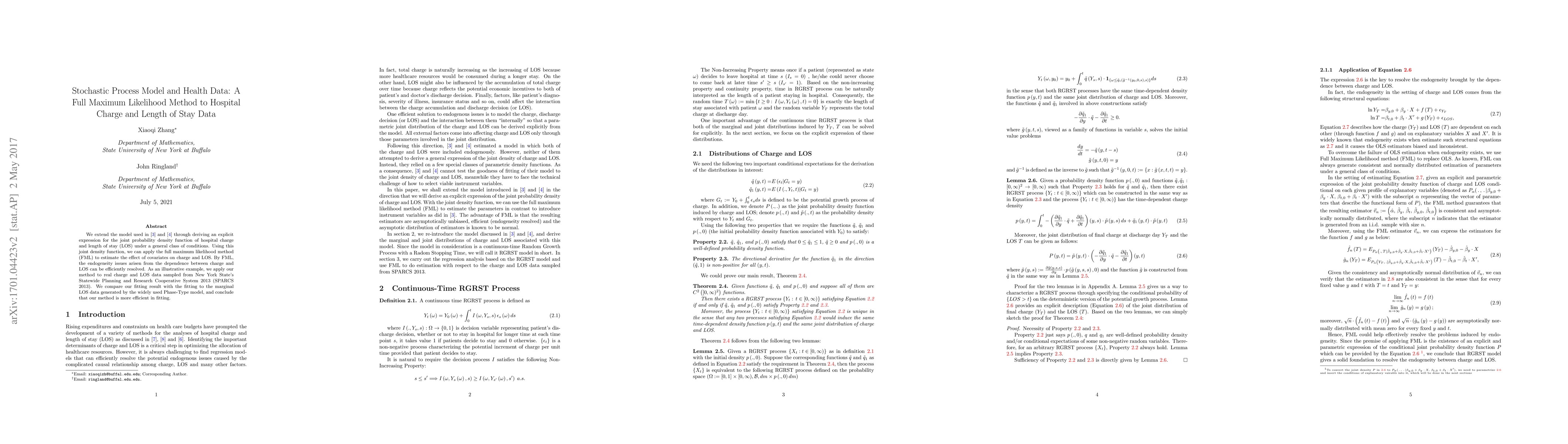 We extend the model used in Gardiner et al. (2002) and Polverejan et al. (2003) through deriving an explicit expression for the joint probability density function of hospital charge and length of stay (LOS) under a general class of conditions. Using this joint density function, we can apply the full maximum likelihood method (FML) to estimate the effect of covariates on charge and LOS. By FML, the endogeneity issues arisen from the dependence between charge and LOS can be efficiently resolved. As an illustrative example, we apply our method to real charge and LOS data sampled from New York State Statewide Planning and Research Cooperative System 2013 (SPARCS 2013). We compare our fitting result with the fitting to the marginal LOS data generated by the widely used Phase-Type model, and conclude that our method is more efficient in fitting.