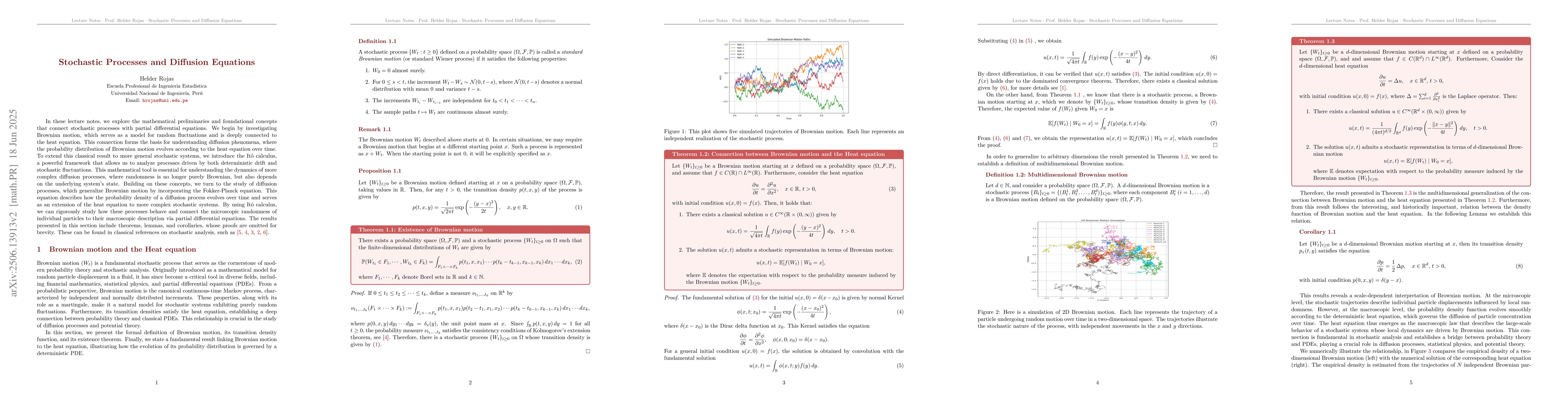 In these lecture notes, we explore the mathematical preliminaries and foundational concepts that connect stochastic processes with partial differential equations. We begin by investigating Brownian motion, which serves as a model for random fluctuations and is deeply connected to the heat equation. This connection forms the basis for understanding diffusion phenomena, where the probability distribution of Brownian motion evolves according to the heat equation over time. To extend this classical result to more general stochastic systems, we introduce the It\^o calculus, a powerful framework that allows us to analyze processes driven by both deterministic drift and stochastic fluctuations. This mathematical tool is essential for understanding the dynamics of more complex diffusion processes, where randomness is no longer purely Brownian, but also depends on the underlying system's state. Building on these concepts, we turn to the study of diffusion processes, which generalize Brownian motion by incorporating the Fokker-Planck equation. This equation describes how the probability density of a diffusion process evolves over time and serves as an extension of the heat equation to more complex stochastic systems. By using It\^o calculus, we can rigorously study how these processes behave and connect the microscopic randomness of individual particles to their macroscopic description via partial differential equations.
