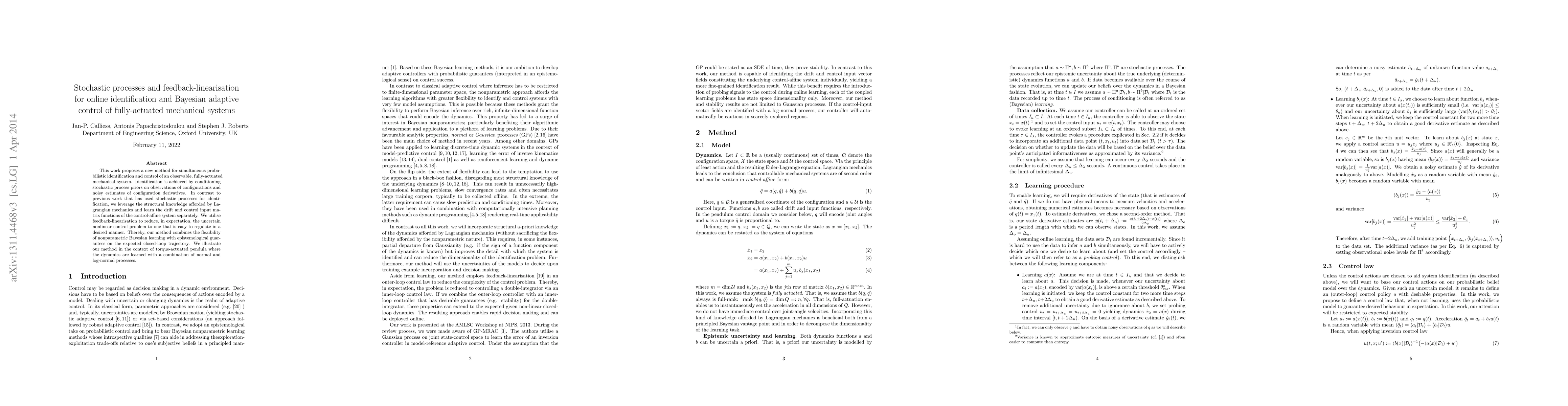 This paper introduces a novel method for online identification and Bayesian adaptive control of fully-actuated mechanical systems using stochastic processes and feedback-linearisation. It leverages Lagrangian mechanics to separately learn system dynamics and control inputs, ensuring effective regulation despite uncertainties.