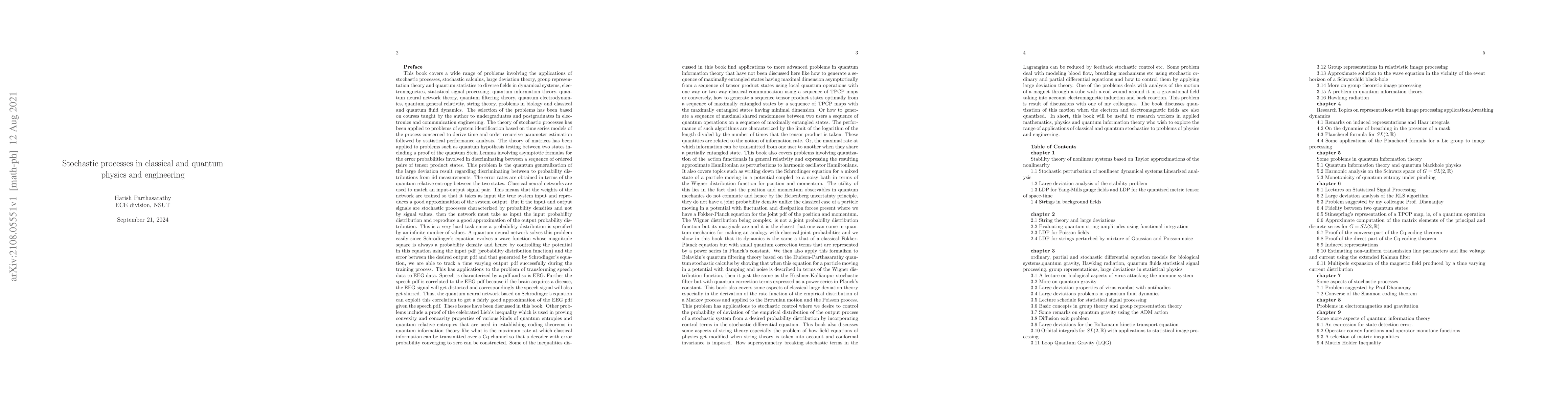This book covers a wide range of problems involving the applications of stochastic processes, stochastic calculus, large deviation theory, group representation theory and quantum statistics to diverse fields in dynamical systems, electromagnetics, statistical signal processing, quantum information theory, quantum neural network theory, quantum filtering theory, quantum electrodynamics, quantum general relativity, string theory, problems in biology and classical and quantum fluid dynamics. The selection of the problems has been based on courses taught by the author to undergraduates and postgraduates in electronics and communication engineering. The theory of stochastic processes has been applied to problems of system identification based on time series models of the process concerned to derive time and order recursive parameter estimation followed by statistical performance analysis.