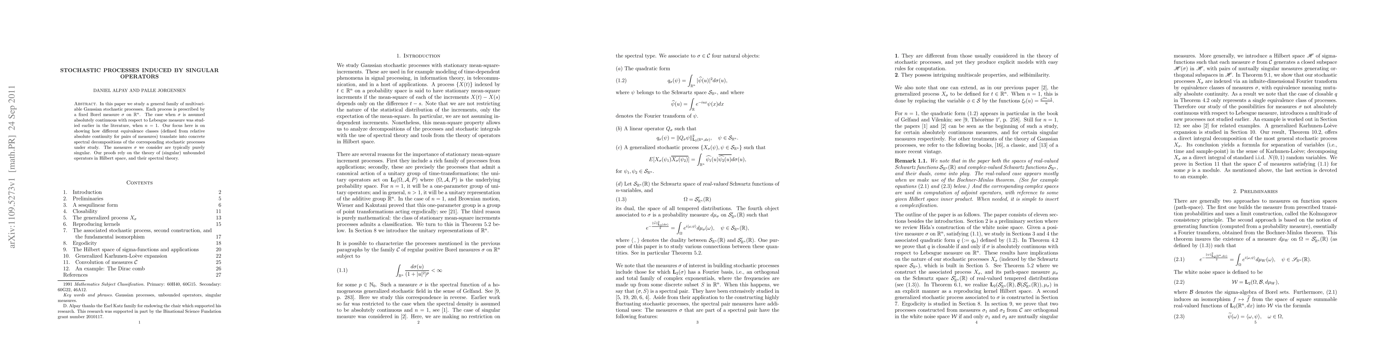 In this paper we study a general family of multivariable Gaussian stochastic processes. Each process is prescribed by a fixed Borel measure $\sigma$ on $\mathbb R^n$. The case when $\sigma$ is assumed absolutely continuous with respect to Lebesgue measure was studied earlier in the literature, when $n=1$. Our focus here is on showing how different equivalence classes (defined from relative absolute continuity for pairs of measures) translate into concrete spectral decompositions of the corresponding stochastic processes under study. The measures $\sigma$ we consider are typically purely singular. Our proofs rely on the theory of (singular) unbounded operators in Hilbert space, and their spectral theory.