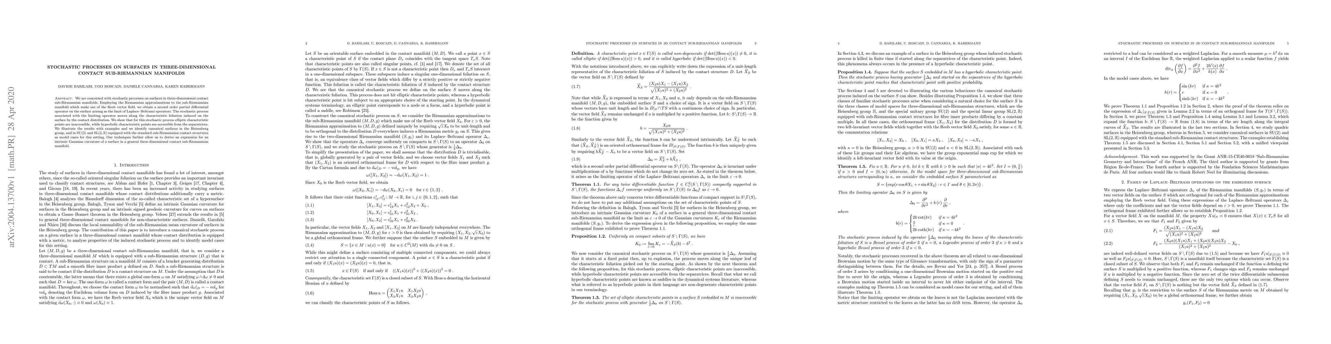 Researchers investigate stochastic processes on surfaces in three-dimensional contact sub-Riemannian manifolds, finding that certain points are inaccessible or accessible depending on the manifold's geometry.
