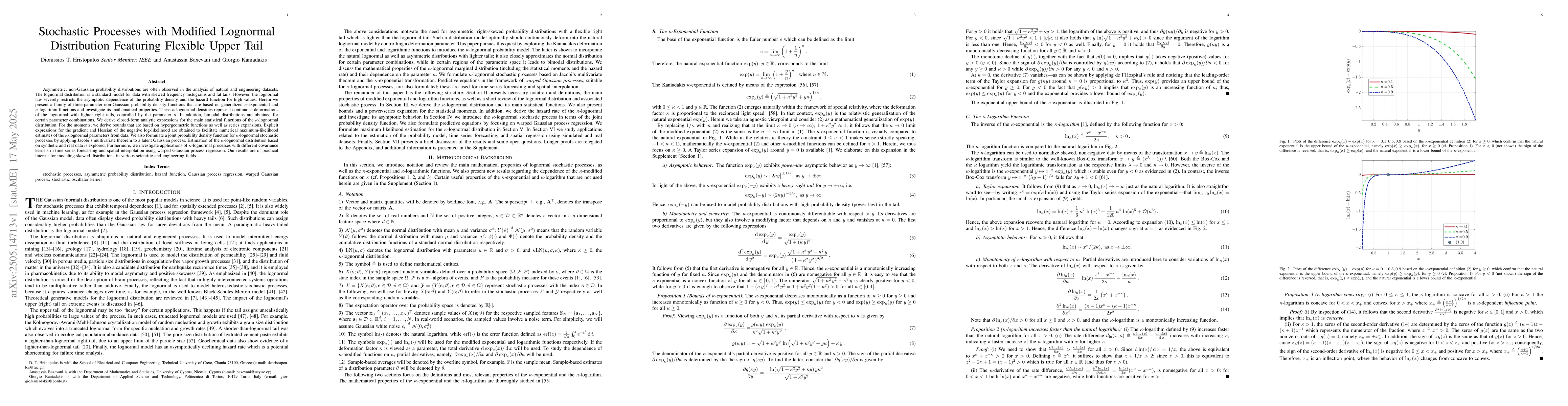 Asymmetric, non-Gaussian probability distributions are often observed in the analysis of natural and engineering datasets. The lognormal distribution is a standard model for data with skewed frequency histograms and fat tails. However, the lognormal law severely restricts the asymptotic dependence of the probability density and the hazard function for high values. Herein we present a family of three-parameter non-Gaussian probability density functions that are based on generalized kappa-exponential and kappa-logarithm functions and investigate its mathematical properties. These kappa-lognormal densities represent continuous deformations of the lognormal with lighter right tails, controlled by the parameter kappa. In addition, bimodal distributions are obtained for certain parameter combinations. We derive closed-form analytic expressions for the main statistical functions of the kappa-lognormal distribution. For the moments, we derive bounds that are based on hypergeometric functions as well as series expansions. Explicit expressions for the gradient and Hessian of the negative log-likelihood are obtained to facilitate numerical maximum-likelihood estimates of the kappa-lognormal parameters from data. We also formulate a joint probability density function for kappa-lognormal stochastic processes by applying Jacobi's multivariate theorem to a latent Gaussian process. Estimation of the kappa-lognormal distribution based on synthetic and real data is explored. Furthermore, we investigate applications of kappa-lognormal processes with different covariance kernels in time series forecasting and spatial interpolation using warped Gaussian process regression. Our results are of practical interest for modeling skewed distributions in various scientific and engineering fields.