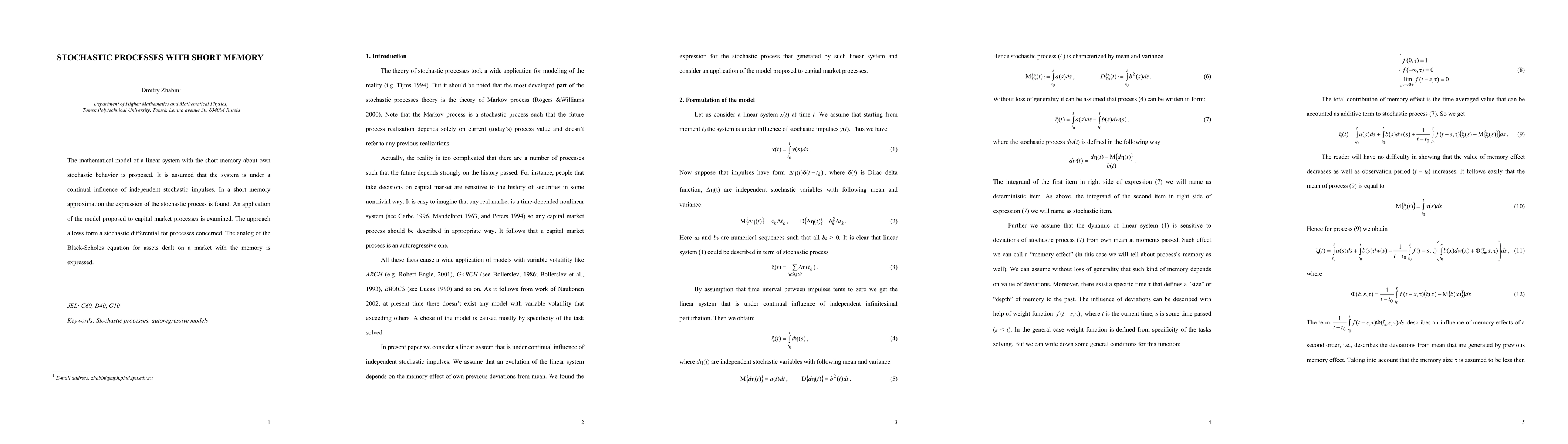 The mathematical model of a linear system with the short memory about own stochastic behavior is proposed. It is assumed that the system is under a continual influence of independent stochastic impulses. In a short memory approximation the expression of the stochastic process is found. An application of the model proposed to capital market processes is examined. The approach allows form a stochastic differential for processes concerned. The analog of the Black-Scholes equation for assets dealt on a market with the memory is expressed.