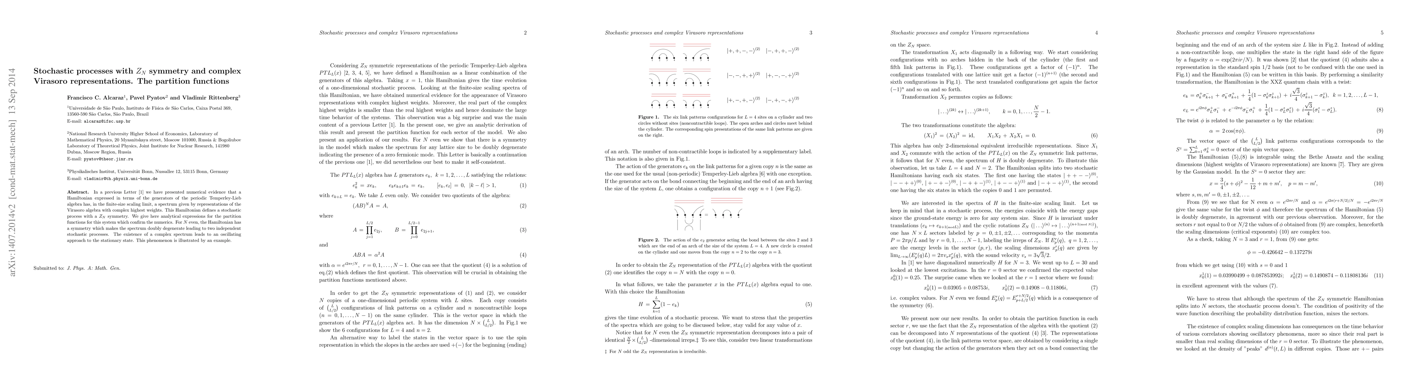 In a previous Letter (J. Phys. A v.47 (2014) 212003) we have presented numerical evidence that a Hamiltonian expressed in terms of the generators of the periodic Temperley-Lieb algebra has, in the finite-size scaling limit, a spectrum given by representations of the Virasoro algebra with complex highest weights. This Hamiltonian defines a stochastic process with a Z_N symmetry. We give here analytical expressions for the partition functions for this system which confirm the numerics. For N even, the Hamiltonian has a symmetry which makes the spectrum doubly degenerate leading to two independent stochastic processes. The existence of a complex spectrum leads to an oscillating approach to the stationary state. This phenomenon is illustrated by an example.