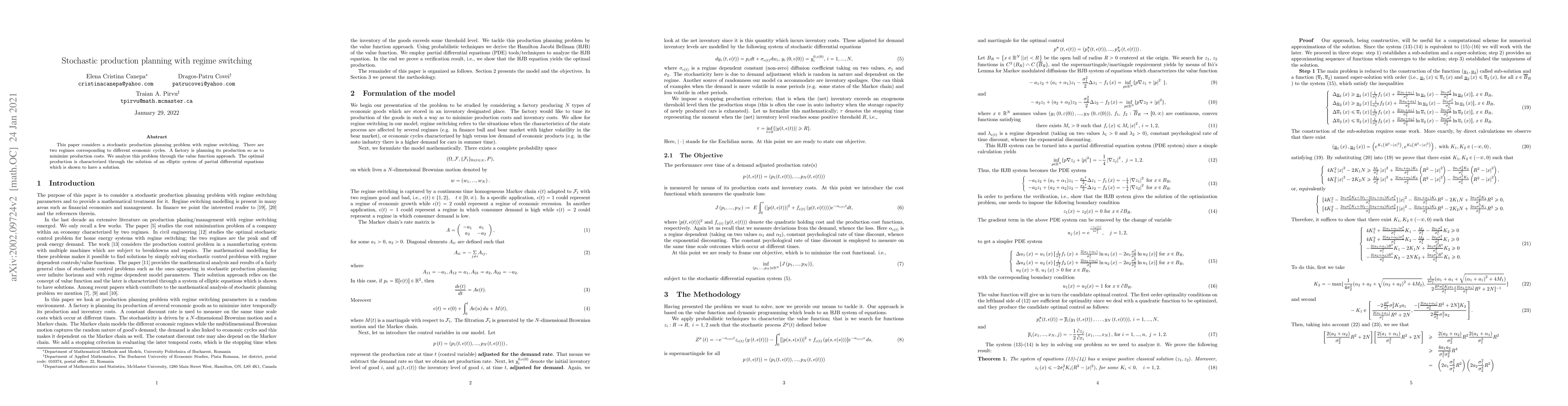 This paper considers a stochastic production planning problem with regime switching. There are two regimes corresponding to different economic cycles. A factory is planning its production so as to minimize production costs. We analyze this problem through the value function approach. The optimal production is characterized through the solution of an elliptic system of partial differential equations which is shown to have a solution.