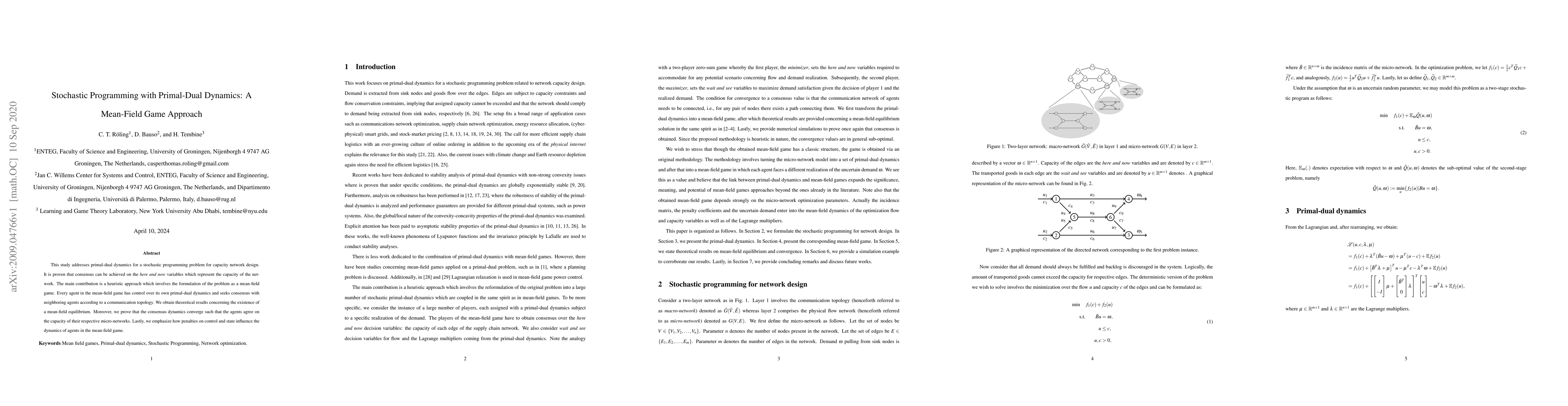 This paper explores primal-dual dynamics in stochastic programming for network capacity design, formulating it as a mean-field game. It demonstrates consensus on network capacity and proves the existence of a mean-field equilibrium, showing that agents converge to agree on their micro-network capacities.