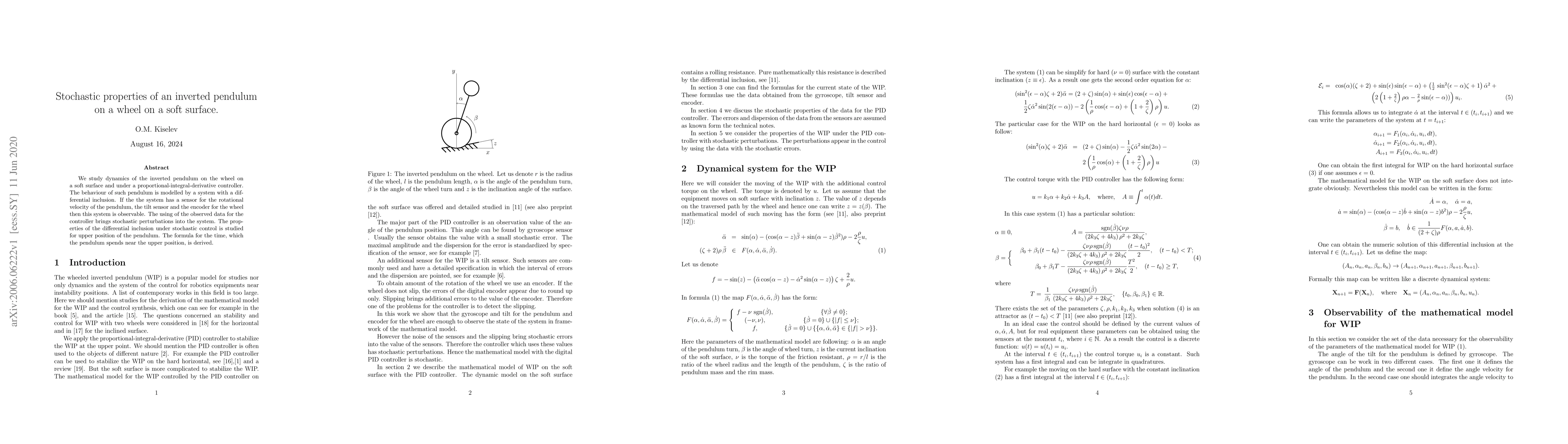 We study dynamics of the inverted pendulum on the wheel on a soft surface and under a proportional-integral-derivative controller. The behaviour of such pendulum is modelled by a system with a differential inclusion. If the the system has a sensor for the rotational velocity of the pendulum, the tilt sensor and the encoder for the wheel then this system is observable. The using of the observed data for the controller brings stochastic perturbations into the system. The properties of the differential inclusion under stochastic control is studied for upper position of the pendulum. The formula for the time, which the pendulum spends near the upper position, is derived.