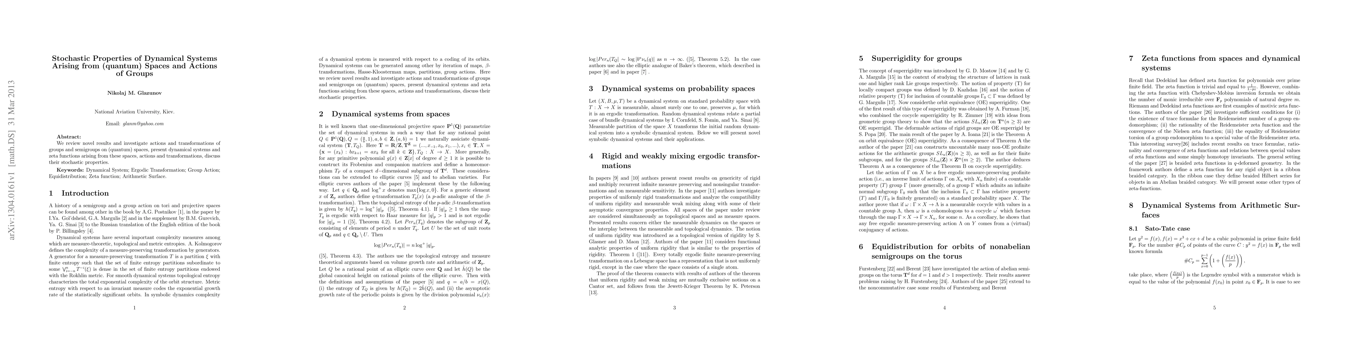 We review novel results and investigate actions and transformations of groups and semigroups on (quantum) spaces, present dynamical systems and zeta functions arising from these spaces, actions and transformations, discuss their stochastic properties.