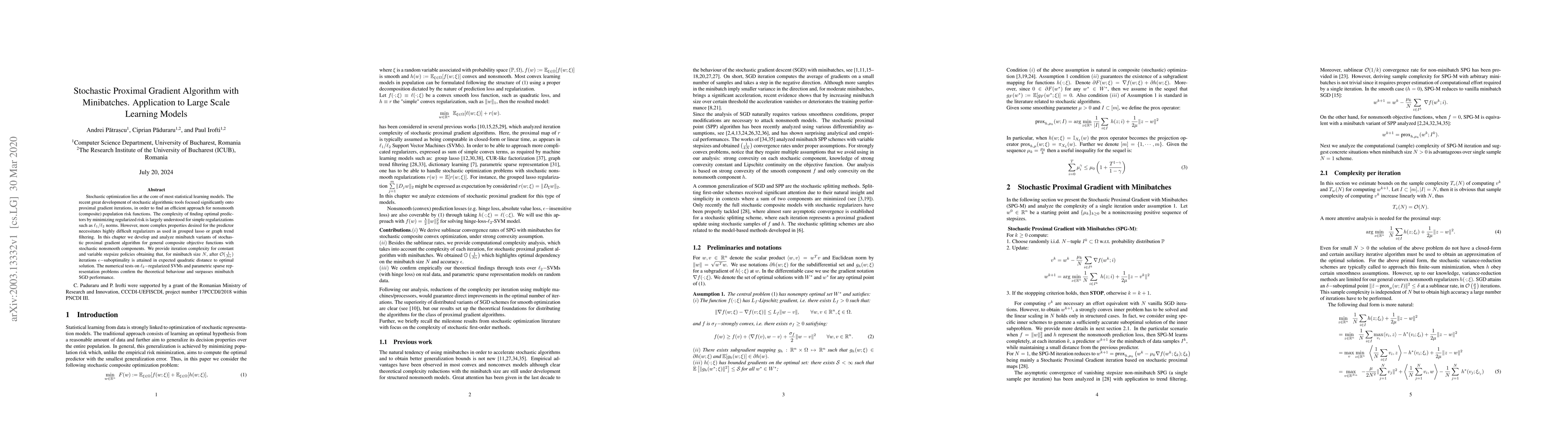 Stochastic optimization lies at the core of most statistical learning models. The recent great development of stochastic algorithmic tools focused significantly onto proximal gradient iterations, in order to find an efficient approach for nonsmooth (composite) population risk functions. The complexity of finding optimal predictors by minimizing regularized risk is largely understood for simple regularizations such as $\ell_1/\ell_2$ norms. However, more complex properties desired for the predictor necessitates highly difficult regularizers as used in grouped lasso or graph trend filtering. In this chapter we develop and analyze minibatch variants of stochastic proximal gradient algorithm for general composite objective functions with stochastic nonsmooth components. We provide iteration complexity for constant and variable stepsize policies obtaining that, for minibatch size $N$, after $\mathcal{O}(\frac{1}{N\epsilon})$ iterations $\epsilon-$suboptimality is attained in expected quadratic distance to optimal solution. The numerical tests on $\ell_2-$regularized SVMs and parametric sparse representation problems confirm the theoretical behaviour and surpasses minibatch SGD performance.