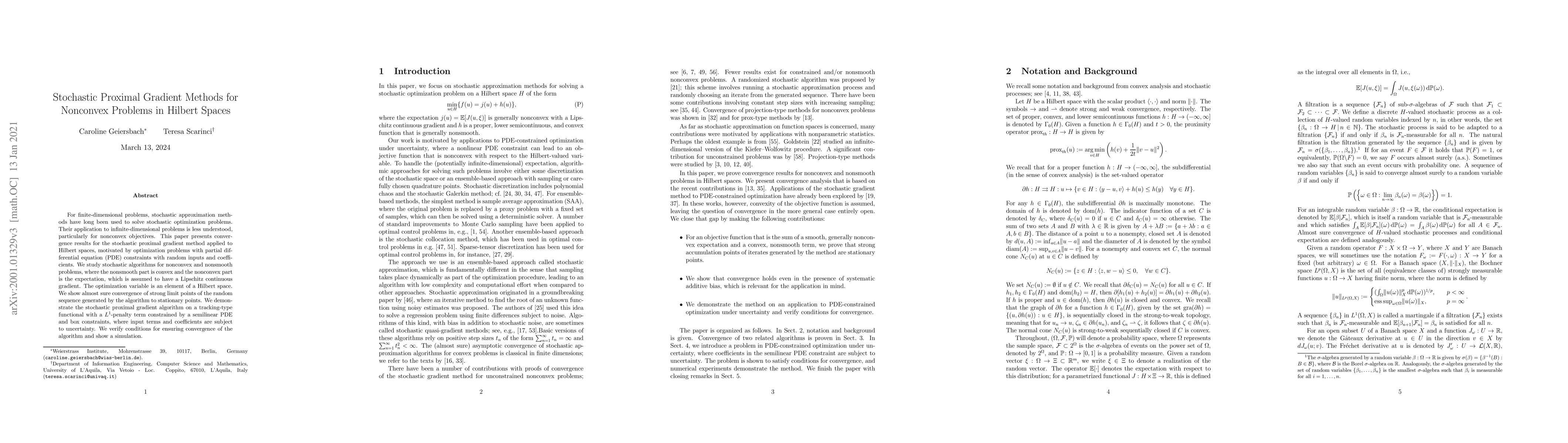 This paper investigates the convergence of stochastic proximal gradient methods for solving nonconvex optimization problems in infinite-dimensional Hilbert spaces, particularly for PDE-constrained problems with random inputs. It demonstrates almost sure convergence to stationary points and applies the method to a tracking-type functional with $L^1$-penalty and semilinear PDE constraints under uncertainty.