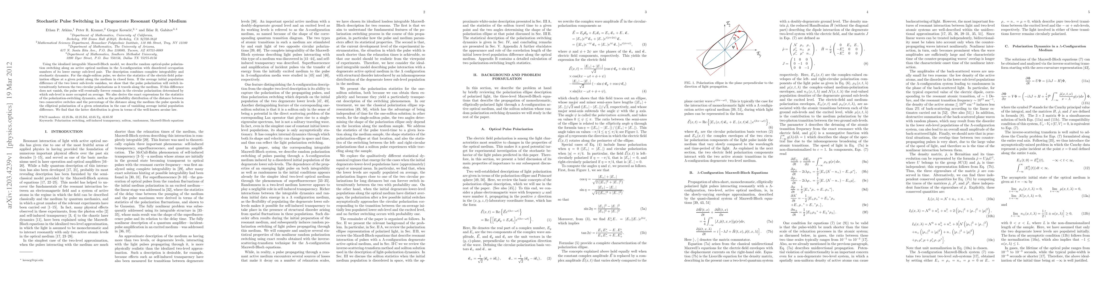 This research uses the Maxwell-Bloch model to study random polarization switching of optical pulses in a disordered active medium. Key findings include closed-form statistics for single-soliton pulse polarization, intermittent switching between circular polarizations with zero average initial sub-level difference, and exact expressions for switching dynamics, including an arcsine law for elliptical polarization duration.