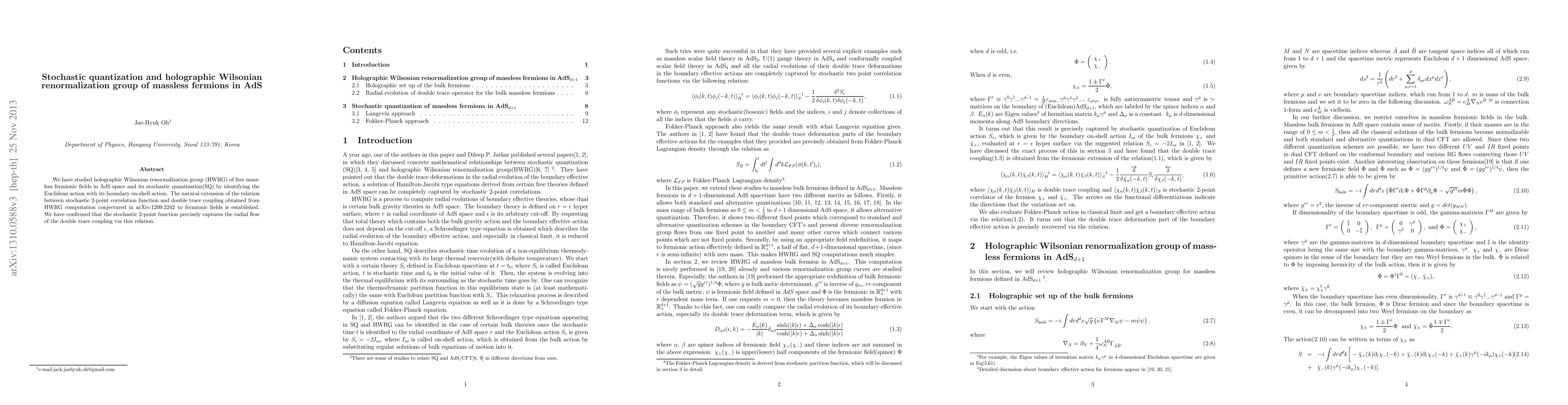 This paper investigates the holographic Wilsonian renormalization group (HWRG) for massless fermions in AdS space, employing stochastic quantization to link the Euclidean action with its boundary on-shell action. The study confirms the extension of a conjectured relation between stochastic 2-point correlation functions and double trace couplings, showing that the stochastic 2-point function accurately reflects the radial flow of the double trace coupling.