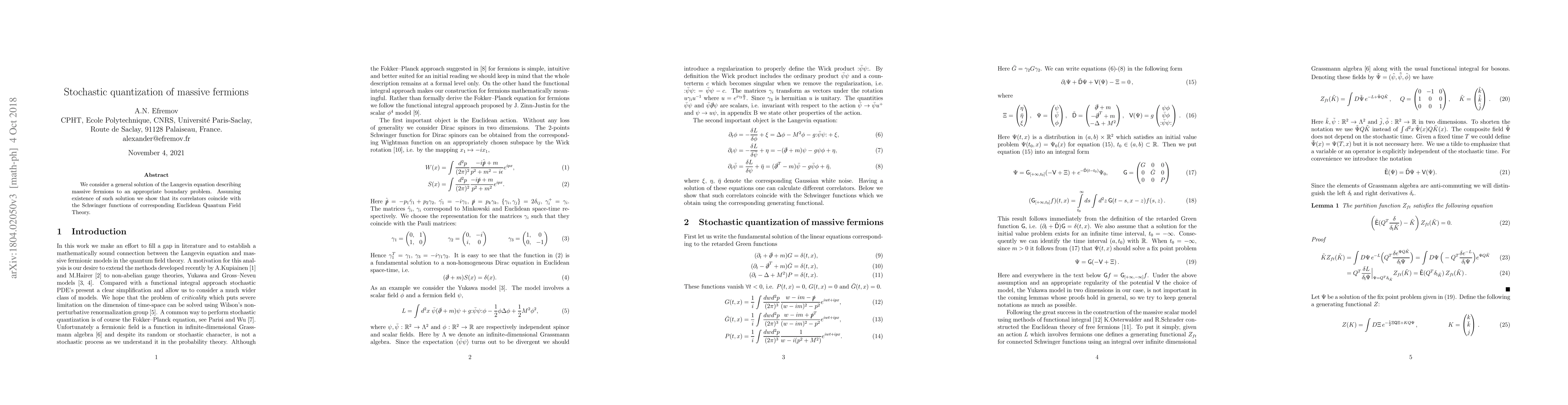 We consider a general solution of the Langevin equation describing massive fermions to an appropriate boundary problem. Assuming existence of such solution we show that its correlators coincide with the Schwinger functions of corresponding Euclidean Quantum Field Theory.