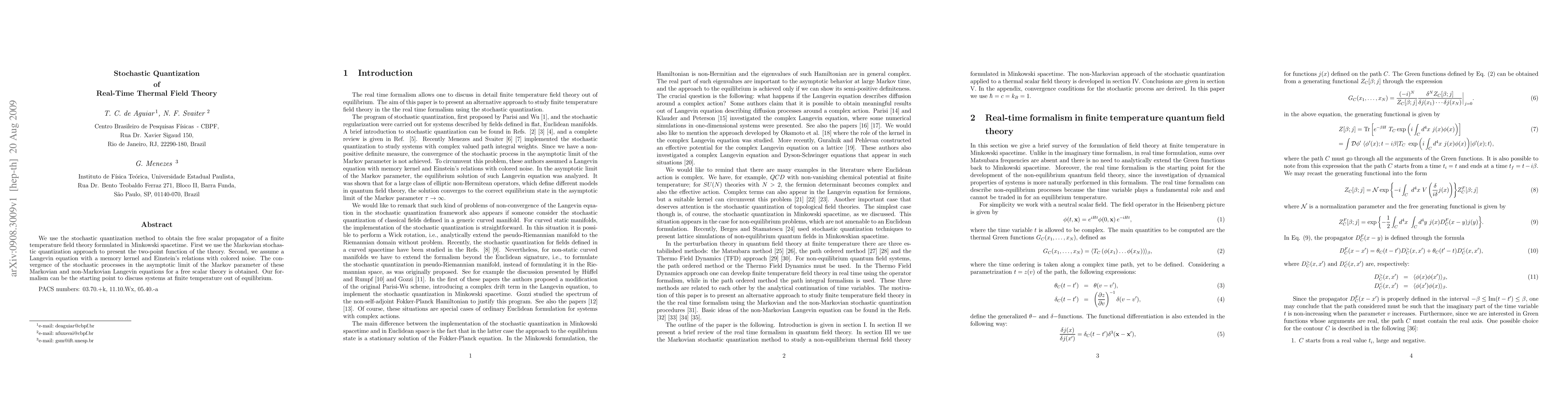 This paper employs stochastic quantization to derive the free scalar propagator in a finite temperature field theory within Minkowski spacetime, utilizing both Markovian and non-Markovian Langevin equations to achieve convergence in the asymptotic limit, providing a foundation for studying out-of-equilibrium systems at finite temperatures.