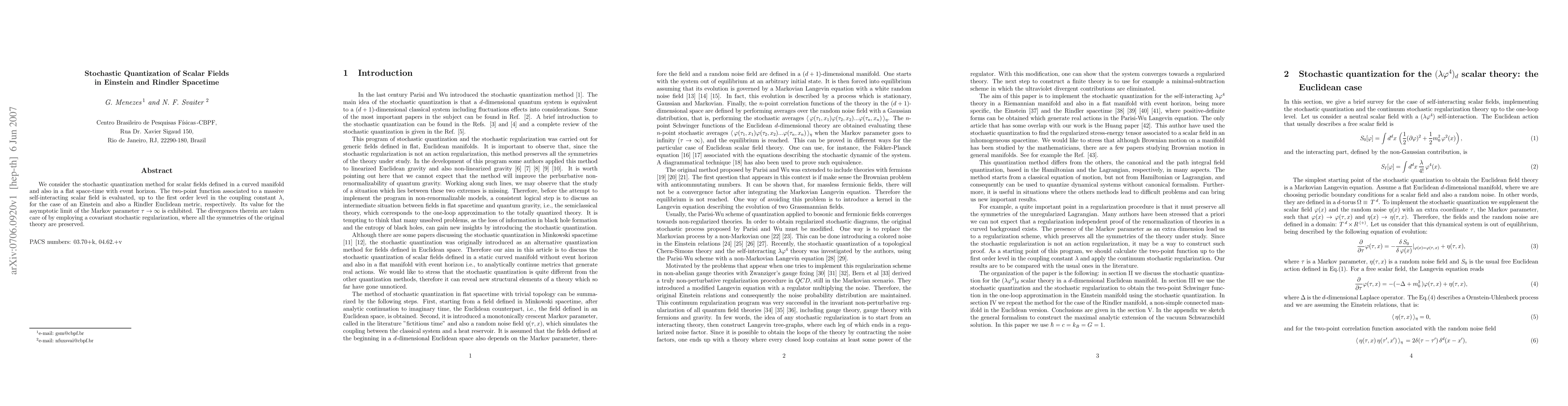 We consider the stochastic quantization method for scalar fields defined in a curved manifold and also in a flat space-time with event horizon. The two-point function associated to a massive self-interacting scalar field is evaluated, up to the first order level in the coupling constant, for the case of an Einstein and also a Rindler Euclidean metric, respectively. Its value for the asymptotic limit of the Markov parameter is exhibited. The divergences therein are taken care of by employing a covariant stochastic regularization.